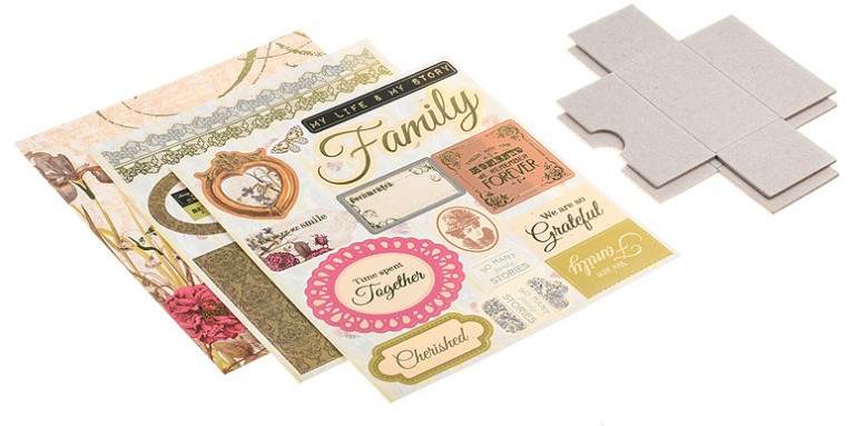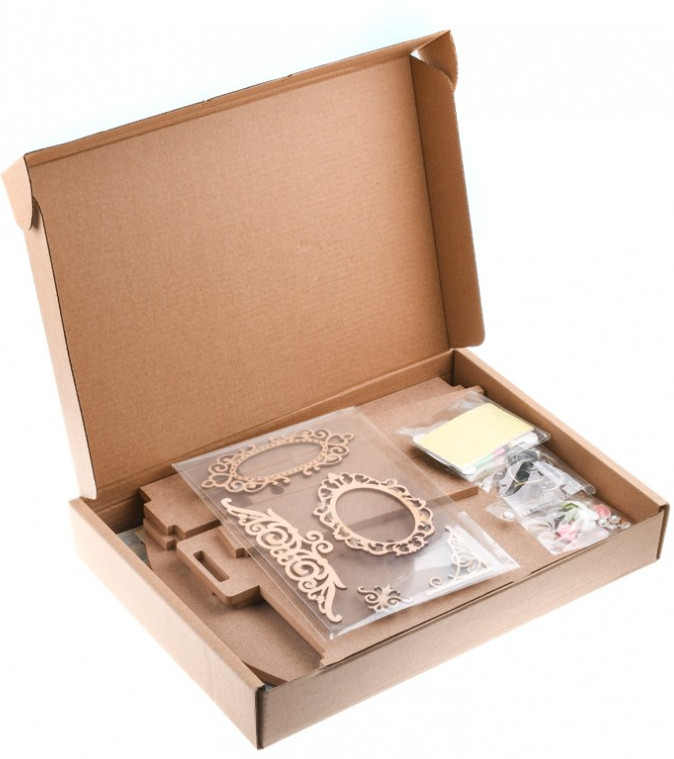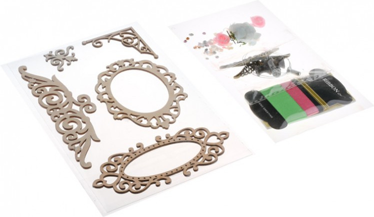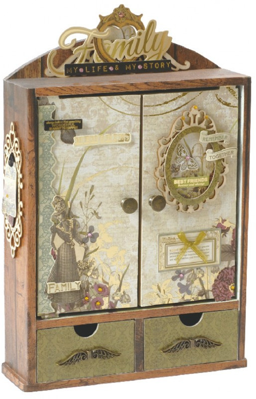 Это интересный набор-конструктор, из которого собирается шкафчик для хранения с большим отделением для хранения разделенным полочкой и двумя ящичками внизу. Детали корпуса выполнены из МДФ толщиной 6 мм, внешние и внутренние поверхности оформляются скрапбумагой и тематическими наклейками. Также в комплекте идут наборы фигурных чипбордов из фанеры толщиной 2 мм. и красивый декор (металлические ручки, ленты, цветы, стразы, полубусины).