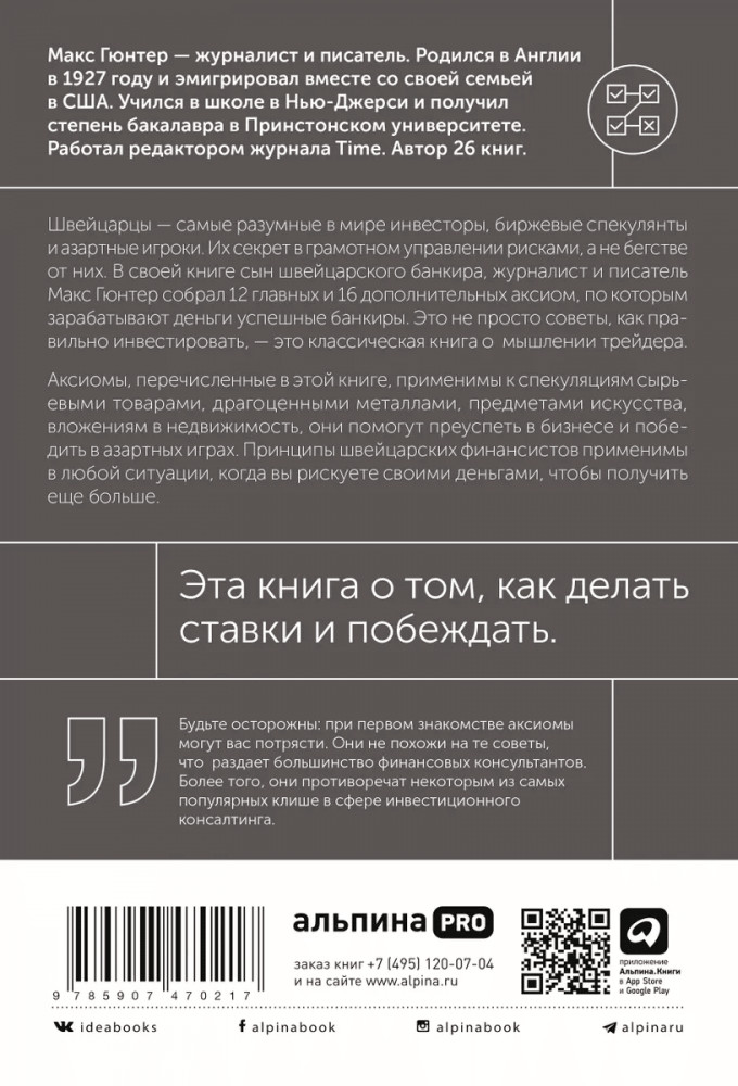💳 Оплатить за товар можно при получении 🇰🇿 Есть бесплатная доставка по Казахстану от 1 дня 🎁 Копите бонусы с каждой покупки В своей книге Макс Гюнтер собрал 12 основных и 16 вспомогательных аксиом — эффективных и простых правил швейцарских финансистов. В их основе — осознанное управление рисками, которому автор научился у своего отца, успешного банкира, много лет работавшего в банке SBC. Прочитав эту книгу, вы научитесь замечать когнитивные ловушки и выстраивать гибкие планы действий, избавитесь от необоснованного оптимизма и наполнитесь энтузиазмом, чтобы учиться на ошибках. Вы начнете делать ставки и побеждать. |