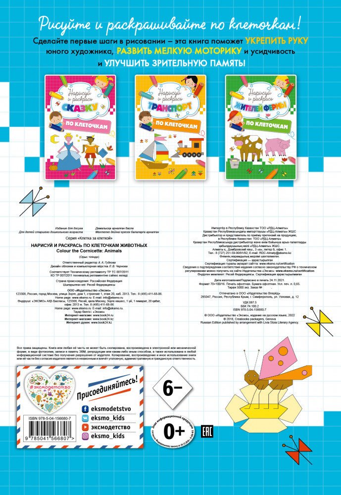 💳 Оплатить за товар можно при получении 🇰🇿 Есть бесплатная доставка по Казахстану от 1 дня 🎁 Копите бонусы с каждой покупки Серия: Клетка за клеткой Откройте для ребёнка мир увлекательного рисования по клеточкам. Нетрудные изображения знакомых животных станут отличной тренировкой руки для маленького художника. А главное, это интересно и увлекательно! В процессе игры ребёнок приобретёт и укрепит очень важные навыки — он будет считать клеточки, проводить прямые линии и в конце раскрашивать получившуюся картинку. Благодаря этому он будет тренировать мелкую моторику, внимательность, память, навыки счёта и развивать фантазию, подбирая цвета для рисунка. Откройте для ребёнка самых клетчатых животных на планете. Пускай первые клеточки станут приятной игрой для вашего малыша! |