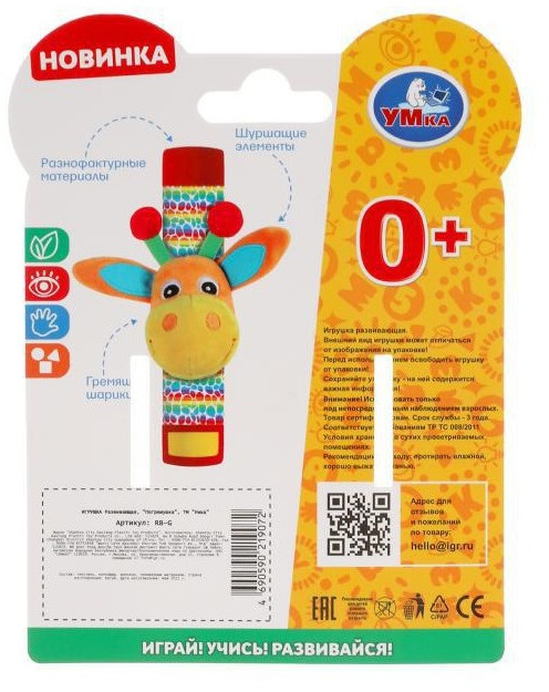 УМка Погремушка-браслет «Жираф»В данный момент этот товар отсутствует в продаже. Возможно, у нас найдется аналогичный или похожий товар здесь. Эта погремушка-браслет в виде милого персонажа, которая к тому же весело гремит непременно приведёт ребёнка в восторг. Погремушка выполнена в красочных цветах из очень мягкого и гипоаллергенного материала. Такая игрушка, если закрепить ее на ножке или ручке малыша, будет побуждать его к движениям, во время которого он начнет развивать их координацию. Форма браслета хороша так же тем, что на прогулке ребёнок не будет ронять ее как обычную игрушку, после чего их обычно приходится долго мыть. |
