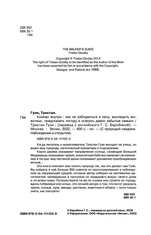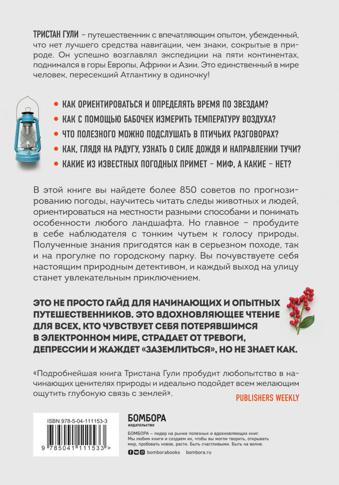 💳 Оплатить за товар можно при получении 🇰🇿 Есть бесплатная доставка по Казахстану от 1 дня 🎁 Копите бонусы с каждой покупки Серия: С природой наедине. Наблюдения и открытия Когда писатель и мореплаватель Тристан Гули выходит на улицу, он видит мир природы, наполненный приметами и подсказками.Корни дерева указывают направление солнца, созвездие Большой Медведицы показывает время, мимолетная бабочка намекает на изменение в погоде, вид песчаной дюны показывает дуновение преобладающих ветров...Эта книга поможет вам понять природу так, как это делает сам Гули. Вы найдете в ней больше 850 советов по прогнозированию и наблюдению за окружающей средой, которые автор собирал на протяжении десятилетий, проведенных в прогулках по ландшафту вокруг своего дома и по всему миру. Путешествуете ли вы по стране или гуляете по городу, вдоль побережья или ночью, это лучший ресурс о том, что могут раскрыть земля, солнце, луна, звезды, растения, животные и облака — если только знать, как смотреть! |