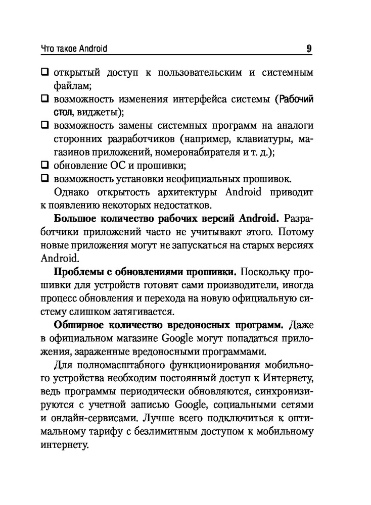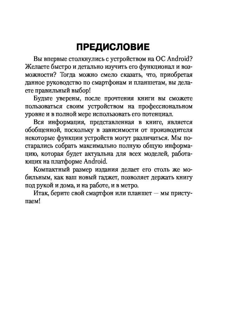 Подробное иллюстрированное руководство по использованию устройств (смартфонов и планшетов) на операционной системе Android. Книга содержит много полезных советов по использованию смартфонов и планшетов, описание различных приложений. Я заказывал данную книгу с доставкой по почте, оплата при получении. Посылка была хорошо упакована, книга доставлена в полной сохранности. Спасибо!