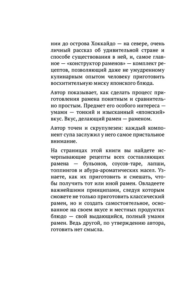 По Японии с отличным аппетитом. Полный гайд по приготовлению раменаВ данный момент этот товар отсутствует в продаже. Возможно, у нас найдется аналогичный или похожий товар здесь. Серия: Еда, города, истории. Книги со вкусом путешествий Почему в любом крупном городе цивилизованного мира можно купить кусок пиццы, гамбургер или суши, а вот пирог с рыбой или тарелку борща — нет? Что делает блюдо популярным? Особый вкус? Доступность ингредиентов? Невысокая цена? Феномен «международной» еды — включает в себя всего несколько блюд. Вот эти чемпионы чемпионов — пицца, гамбургер, суши... Попробуйте продолжить сами. Будете удивлены — вам хватит пальцев одной руки. Около 20 лет назад в ряды «международных» чемпионов ворвался японский суперсуп рамен. Сначала в США, затем в Европе открылись и стали популярными тысячи рамен-шопов. Рамены вошли в меню мишленовских ресторанов. Тем не менее до сих пор единственный способ попробовать приличный, полный умами рамен в России — приготовить его самому. Первый на русском языке широкоформатный гайд по рамену делает процесс его приготовления сравнительно простым и увлекательным. Автору можно доверять. Однажды случайно попав в Японию, он остался там на годы. Путешествовал, учил язык, влюбился в японскую поэзию. Изучал локальные кухни, адаптировал рецепты, придумывал собственные. Открыл успешный рамен-шоп. Женился на японке. Поделился своим кулинарным опытом. Если еще вчера у вас были отговорки — рецепт сложен и непонятен, готовить долго и скучно, то теперь все не так. Открыл книгу, сходил в магазин, заперся на кухне — готово! |