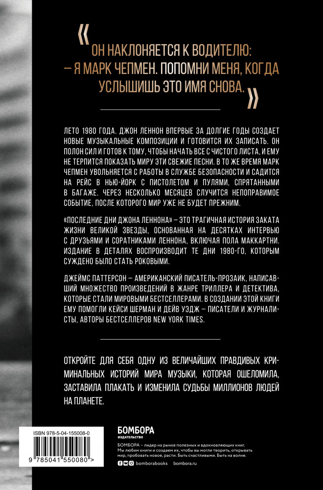 Последние дни Джона ЛеннонаКейси Шерман, Дейв Уэдж, Джеймс Б. Паттерсон В данный момент этот товар отсутствует в продаже. Возможно, у нас найдется аналогичный или похожий товар здесь. Серия: The Beatles. Книги о величайшей группе столетия Лето 1980 года. Джон Леннон впервые за долгие годы создает новые музыкальные композиции и готовится их записать. Он полон сил и готов к тому, чтобы начать все с чистого листа, и ему не терпится показать миру эти свежие песни. В то же время Марк Чепмен увольняется с работы в службе безопасности и садится на рейс в Нью-Йорк с пистолетом и пулями, спрятанными в багаже. Через несколько месяцев случится непоправимое событие, после которого мир уже не будет прежним. |