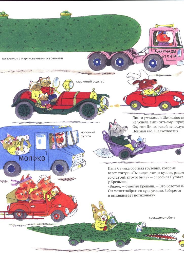 Рисунков много. Машины нарисованы самые разнообразные, и существующие и выдуманные. Читать практически нечего. Для детей поменьше (год-два), пожалуй, очень даже неплохо.