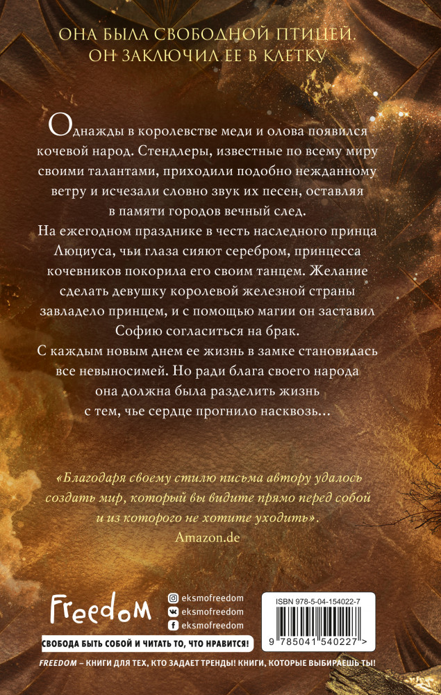 Принц из серебра и золотаВивиана Ипарагирре де лас Кассас В данный момент этот товар отсутствует в продаже. Возможно, у нас найдется аналогичный или похожий товар здесь. Серия: Young Adult. Немецкое магическое фэнтези Однажды в королевстве меди и олова появился кочевой народ. Стендлеры, известные по всему миру своими талантами, приходили подобно нежданному ветру и исчезали словно звук их песен, оставляя в памяти городов вечный след. На ежегодном празднике в честь наследного принца Люциуса, чьи глаза сияют серебром, принцесса кочевников покорила его своим танцем. Желание сделать девушку королевой железной страны завладело принцем, и с помощью магии он заставил Софию согласиться на брак. С каждым новым днем ее жизнь в замке становилась все невыносимей. Но ради блага своего народа она должна была разделить жизнь с тем, чье сердце прогнило насквозь... |