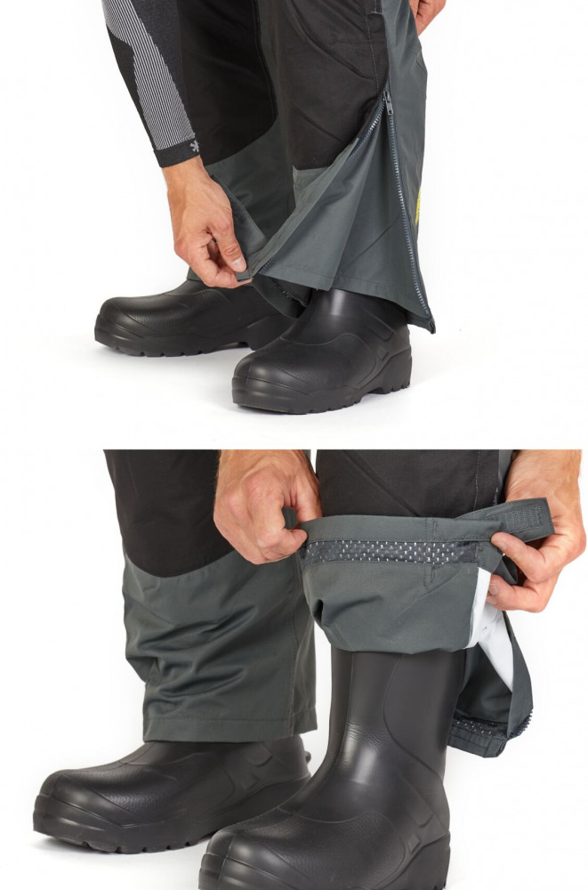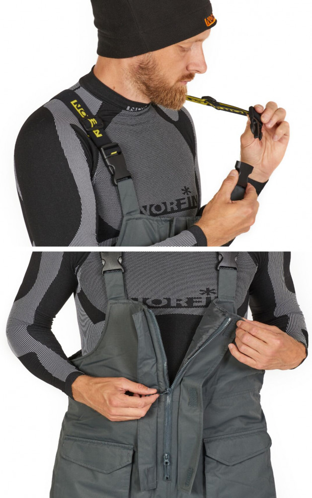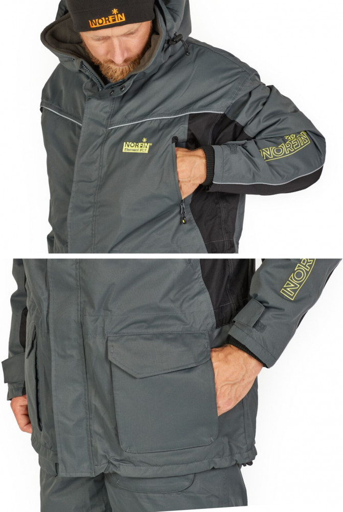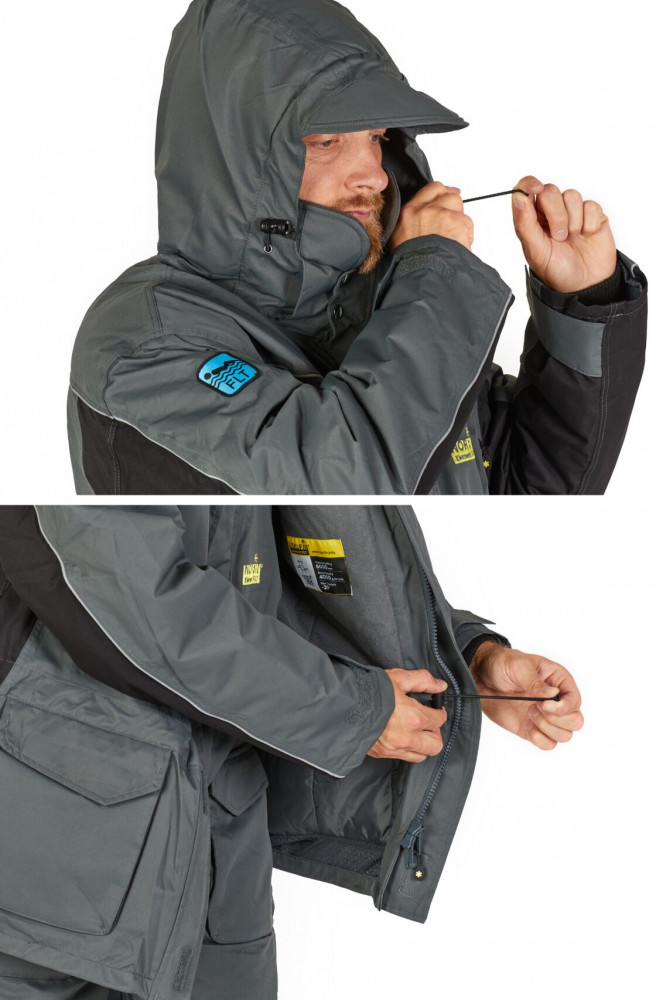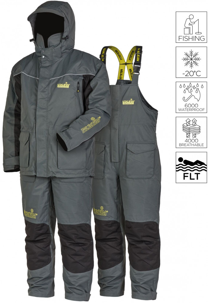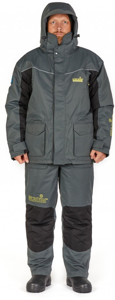 Утеплитель костюма обладает плавающими свойствами, не стесняет движения. Защита рыболова при попадании в воду. Материал костюма — ветро- и водонепроницаемая мембранная ткань. Костюм предназначен для эксплуатации при температуре до —20°C.