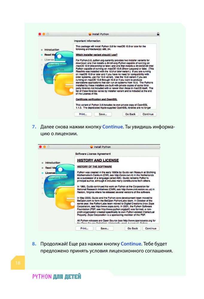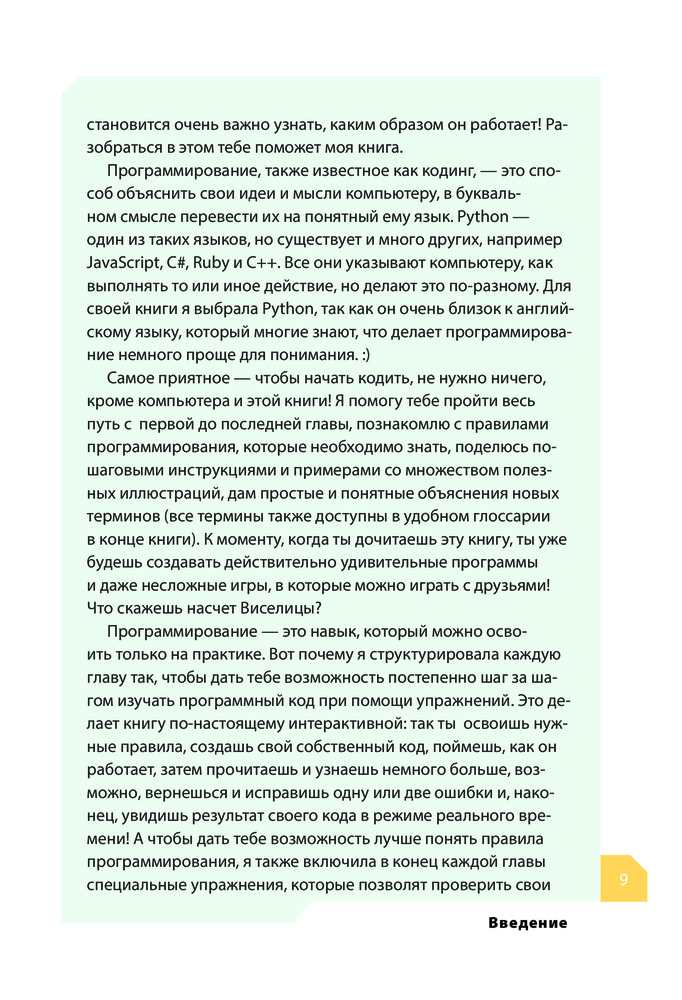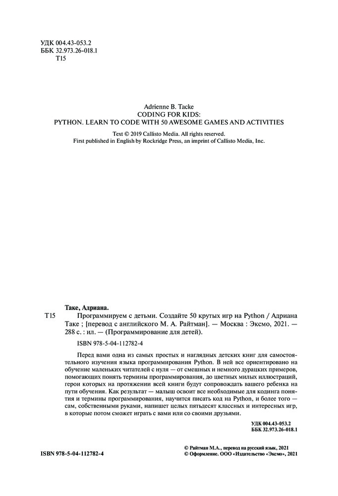 Программируем с детьми. Создайте 50 крутых игр на PythonВ данный момент этот товар отсутствует в продаже. Возможно, у нас найдется аналогичный или похожий товар здесь. Серия: Программирование для детей Перед вами одна из самых простых и наглядных детских книг для самостоятельного изучения языка программирования Python. В ней все ориентировано на обучение маленьких читателей с нуля — от смешных и немного дурацких примеров, помогающих понять термины программирования, до цветных милых иллюстраций, герои которых на протяжении всей книги будут сопровождать вашего ребенка на пути обучения. Как результат — малыш освоит все необходимые для кодинга понятия и термины программирования, научится писать код на Python и более того — сам собственными руками напишет целых пятьдесят классных и интересных игр, в которые потом сможет играть с вами или со своими друзьями. |