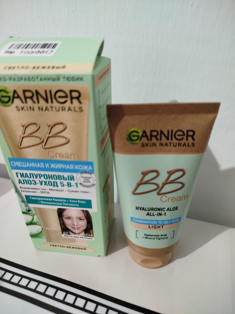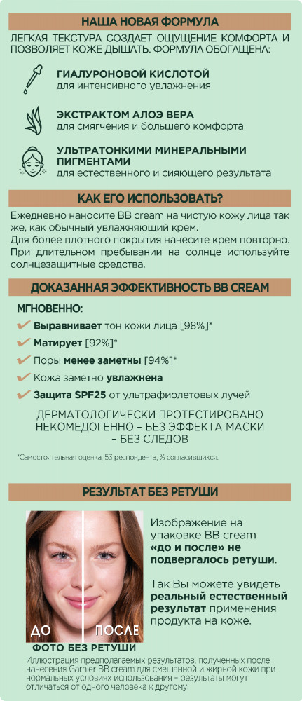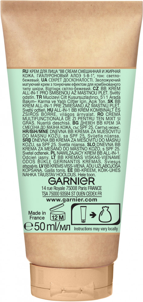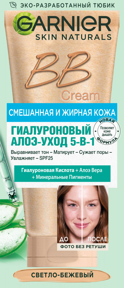 Garnier BB крем гиалуроновый «Алоэ-уход 5-в-1» для смешанной и жирной кожи с гиалуроновой кислотой, алоэ вера и минеральными пигментами SPF 25