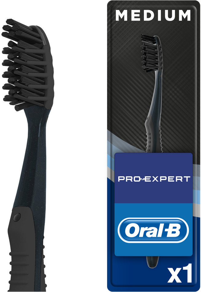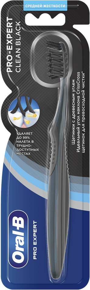 Мануальная зубная щётка Oral-B Pro-Expert Clean Black со щетинками CrissCross, расположенными под углом 16 градусов, эффективно счищает зубной налёт и удаляет до 99% налёта в труднодоступных местах в отличие от обычной мануальной зубной щётки. Благодаря тщательно отполированным щетинкам с закруглёнными концами щётка очищает зубы вдоль линии дёсен. Кроме того, щётка укрепляет здоровье дёсен и делает их более упругими, способствуя уменьшению воспаления дёсен благодаря мягким стимуляторам. Рельефная поверхность для чистки языка помогает удалять микробы с поверхности языка и дарит ощущение свежести в полости рта. Щетинки средней жёсткости с экстрактом древесного угля. Напоминаем о замене щётки каждые три месяца для лучшей чистки.