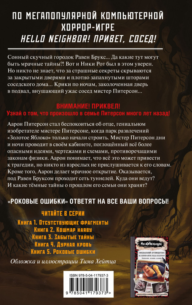 💳 Оплатить за товар можно при получении 🇰🇿 Есть бесплатная доставка по Казахстану от 1 дня 🎁 Копите бонусы с каждой покупки Серия: Hello Neighbor. Привет, сосед Аарон Питерсон стал беспокоиться об отце, гениальном изобретателе мистере Питерсоне, когда парк развлечений «Золотое Яблоко» только начали строить. Мистер Питерсон дни и ночи проводит в своём кабинете, поглощенный всё более опасными идеями, чертежами и схемами, противоречащими законам физики. Аарон понимает, что всё это может привести к трагедии, но никто из взрослых не прислушивается к его словам. Кроме того, Аарон делает мрачное открытие. Оказывается, под Равен Бруксом проходит сеть туннелей. Куда они ведут? И какие тёмные тайны о прошлом его семьи они хранят? |