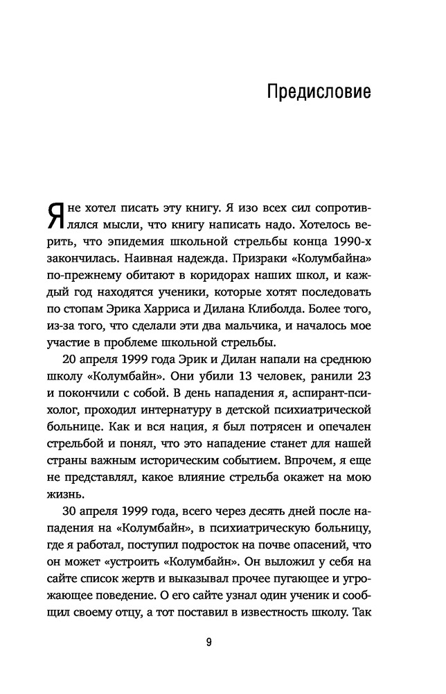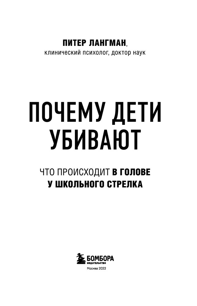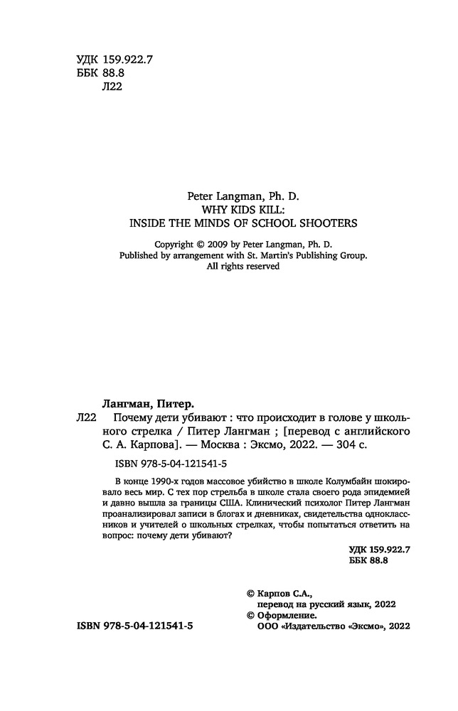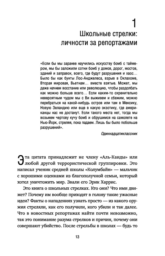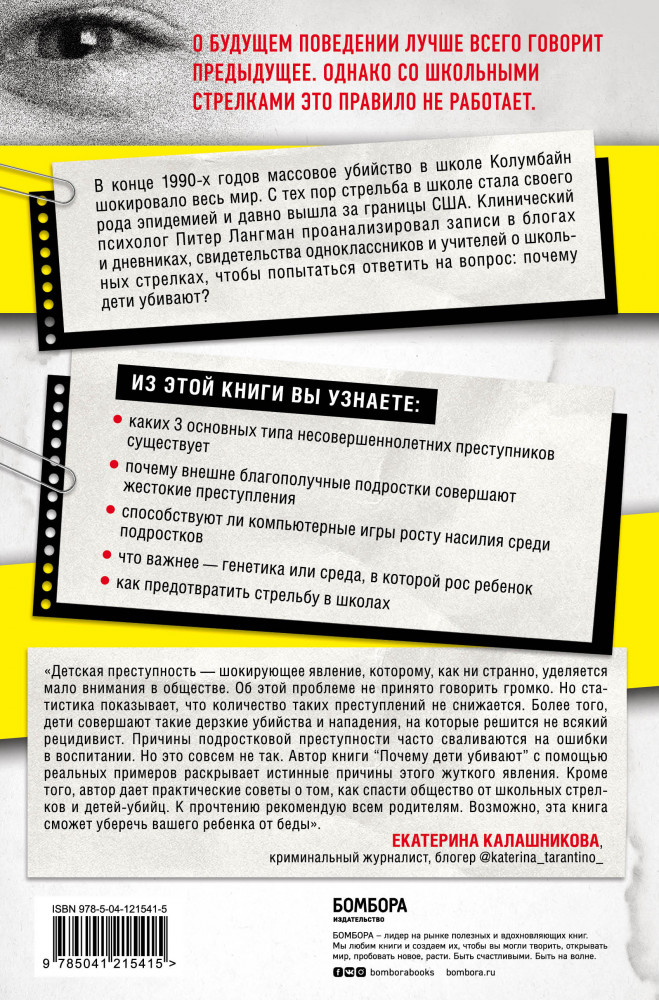 💳 Оплатить за товар можно при получении 🇰🇿 Есть бесплатная доставка по Казахстану от 1 дня 🎁 Копите бонусы с каждой покупки Серия: Profiling. Искусство вычислять преступников О будущем поведении лучше всего говорит предыдущее. Однако со школьными стрелками это правило не работает. В конце 1990-х годов массовое убийство в школе Колумбайн, шокировало весь мир. С тех пор стрельба в школе стала своего рода эпидемией и давно вышла за границы США. Клинический психолог Питер Лангман проанализировал записи в блогах и дневниках, свидетельства одноклассников и учителей о школьных стрелках, чтобы попытаться ответить на вопрос: почему дети убивают? |