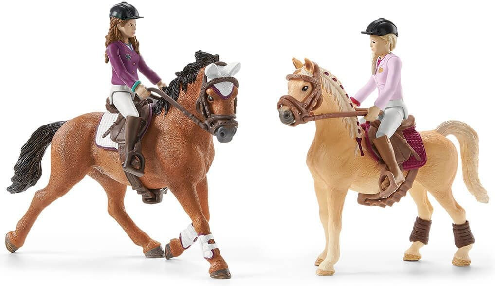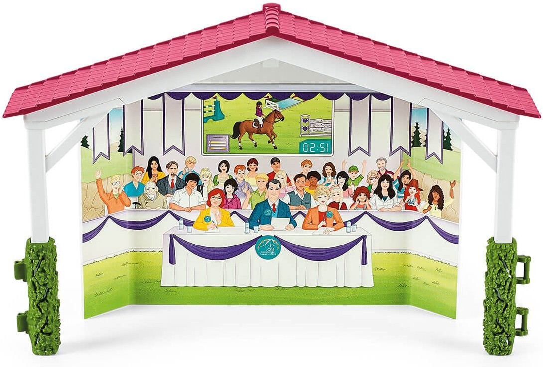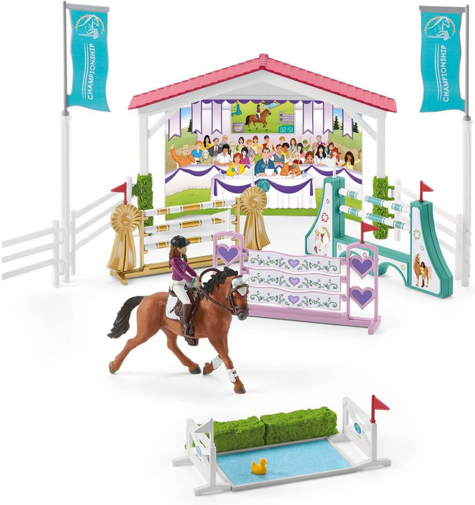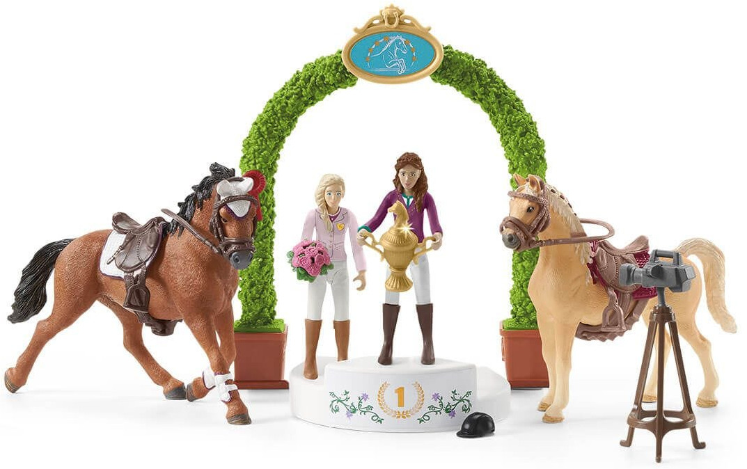 Schleich Набор игровой «Конный дружеский турнир»В данный момент этот товар отсутствует в продаже. Возможно, у нас найдется аналогичный или похожий товар здесь. Серия: Horse Club В товарищеском турнире Schleich Horse Club София скачет верхом на арабской кобыле, а Лиза — на тракененской лошади. Большое разнообразие игровых функций и обширный набор аксессуаров доставляют огромное удовольствие от игры. Полностью подвижные фигурки девушек чистят в стойле лошадей щеткой и скребком для копыт и надевают сёдла и уздечки. Прежде чем отправиться в путь, они надевают шлемы. Турнирная полоса окружена заборами и ведет через два высоких препятствия. Одно из них украшено сердечками, а другое расписано золотом. Перед внушающей страх канавой с водой требуется полная концентрация. Два флага развеваются на ветру, и вдруг за тюками соломы мелькает мышь! Зрители на трибунах напряжены и взволнованы. Будут ли лошади сбиты с толку? После турнира на церемонии награждения победителям вручают букет цветов и ленты. Камера на штативе позволяет сделать отличные фотографии на память. |