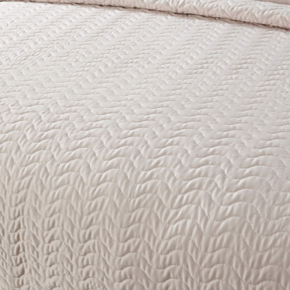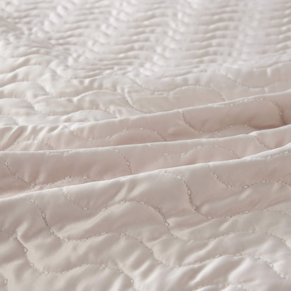 Коллекцию характеризуют сдержанные цвета с широкой палитрой сочетаний: серый, стоун, пудра, кофе, лаконичный волнистый узор, выступающий над поверхностью ткани, объёмная фактура, мягкость и гладкость атласного материала, деликатный кант по периметру изделия.