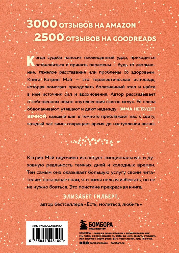 Зима не будет вечной. Искусство восстановления после ударов судьбыВ данный момент этот товар отсутствует в продаже. Возможно, у нас найдется аналогичный или похожий товар здесь. Серия: Бестселлеры саморазвития Когда судьба наносит неожиданный удар, приходится остановиться, выдохнуть и принять перемены — будь то увольнение, тяжелое расставание или проблемы со здоровьем. Приходится принять холод, завладевший жизнью, и попробовать изменить отношение к нему. Автор, Кэтрин Мэй, рассказывает, как она сумела пережить болезненный этап своей жизни и даже нашла в нем источник вдохновения и сил. «Зима не будет вечной» — это трогательная, чуткая и медитативная книга о тихой красоте зимы, целительной силе отдыха и важности заботы о себе. А еще — очень важное напоминание о том, что времена года в конце концов сменяют друг друга. |