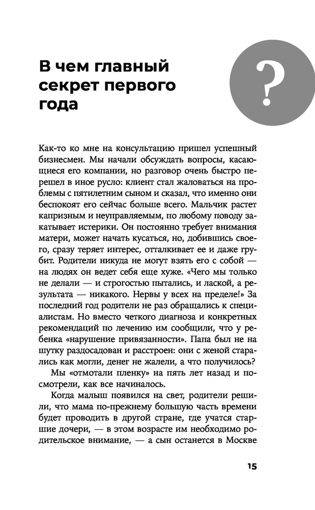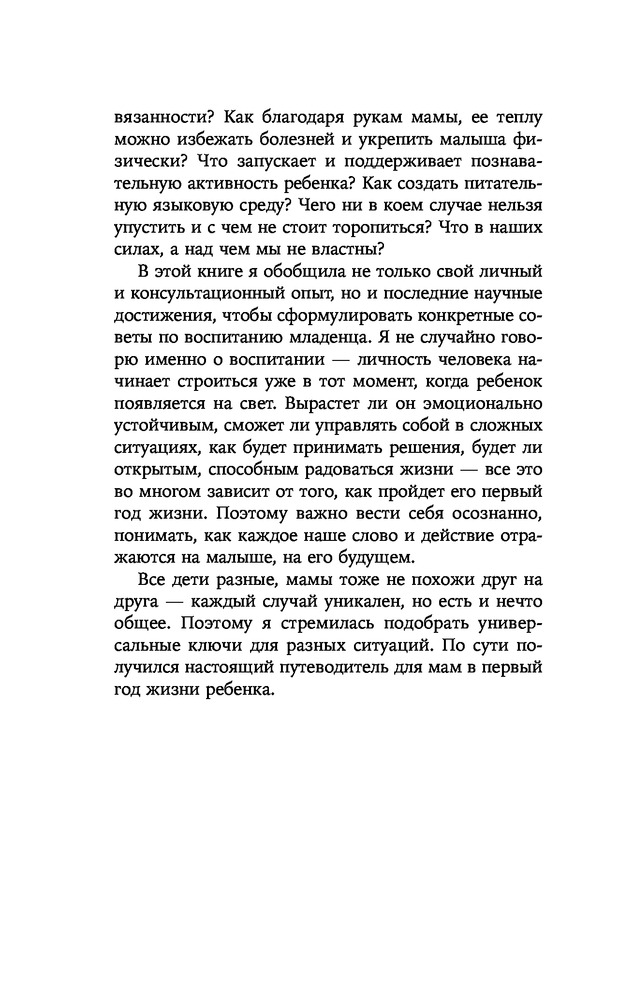 Очень полезная книга для мам, о том, как важен первый год жизни малыша, о том что роль мамы невозможно переоценить, о том как важна надёжная привязанность. Многие уверены, что в первый год жизни малыша, он нуждается только в заботе и уходе, на самом деле это не так. Это самый главный год жизни каждого человека, это фундамент будущей жизни, характера малыша, его интеллектуального развития.