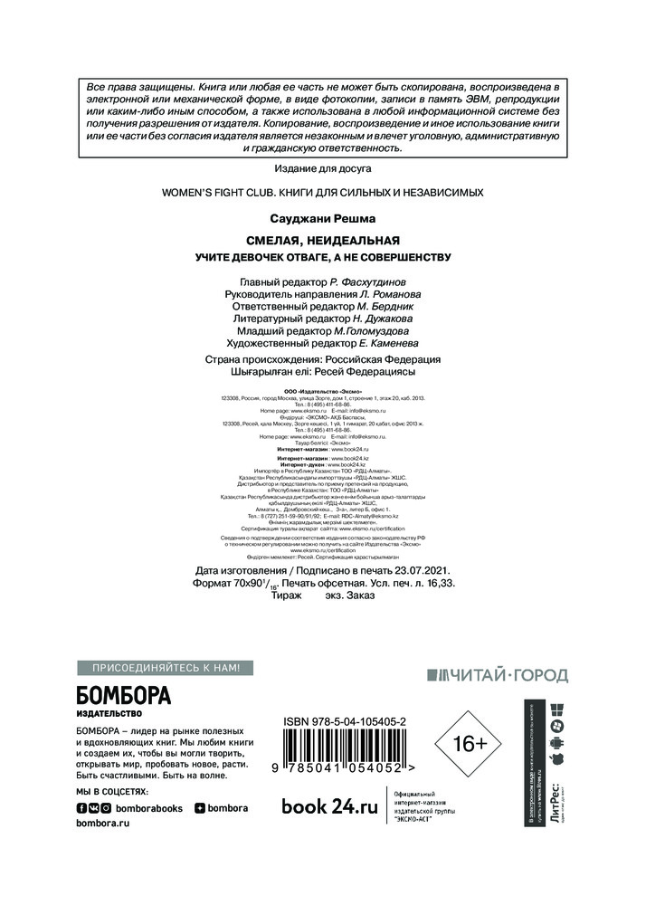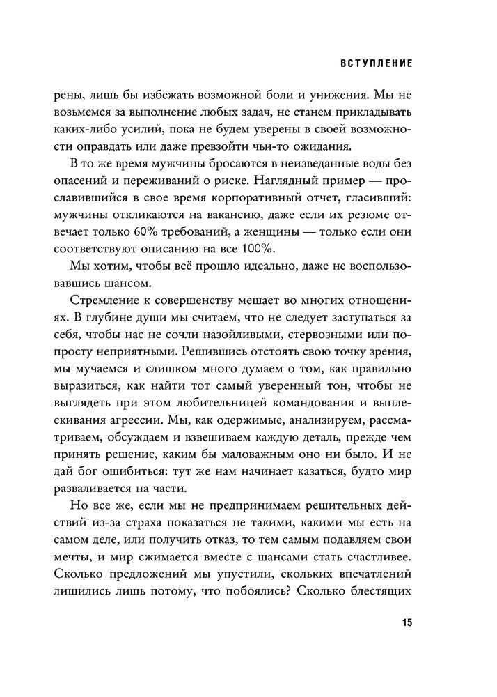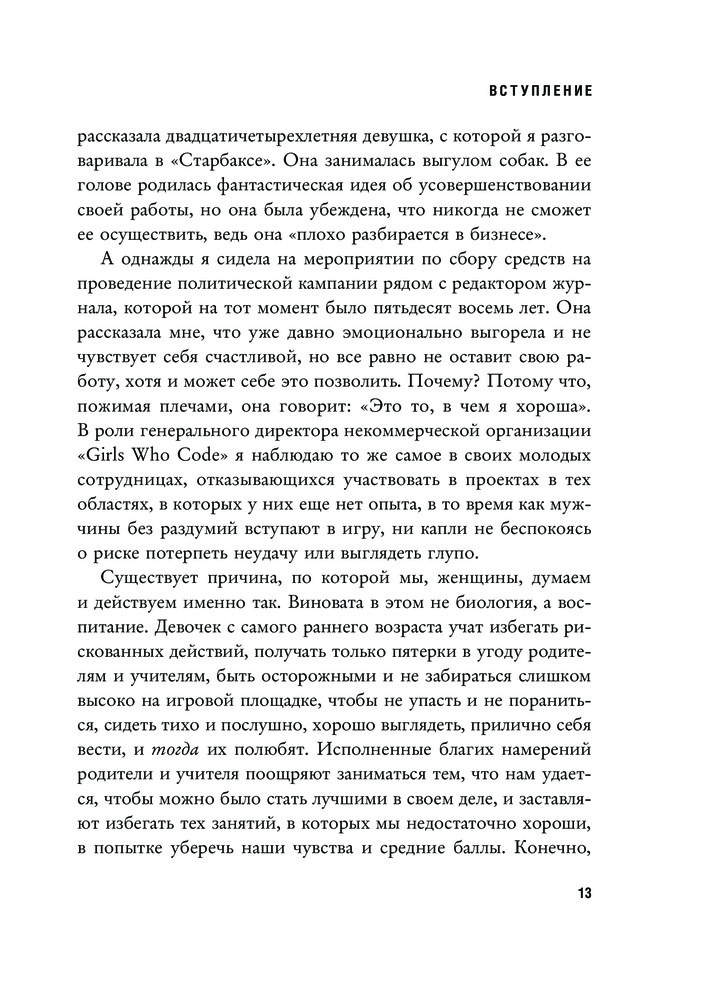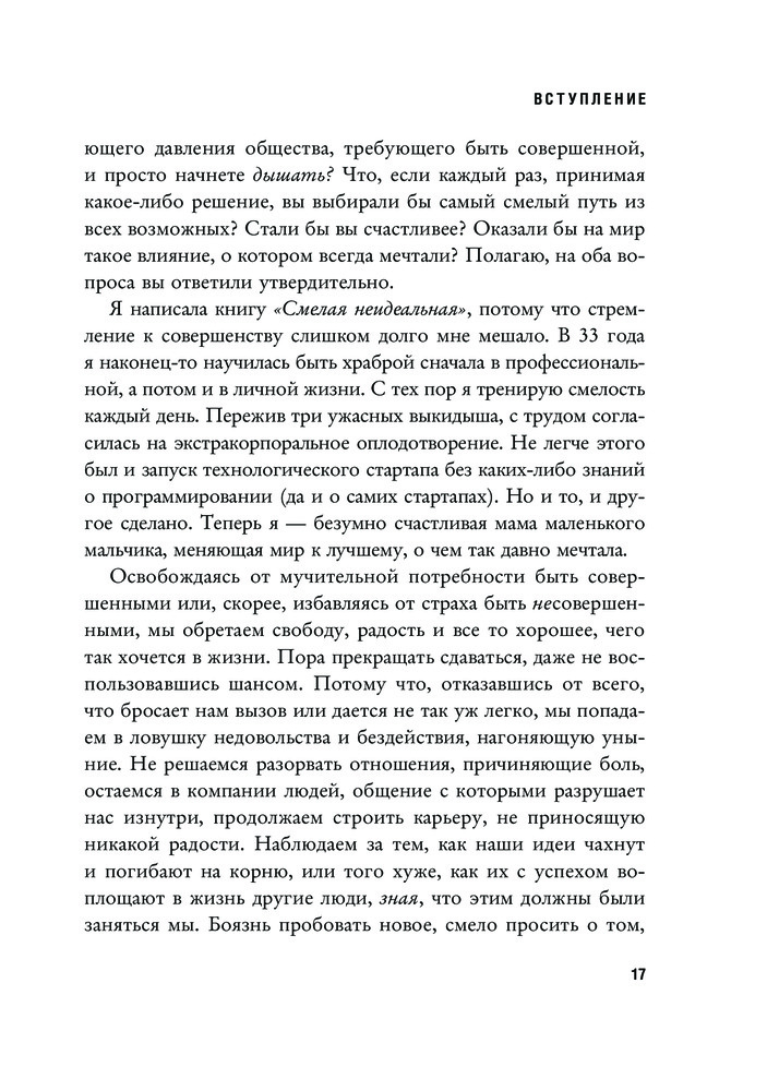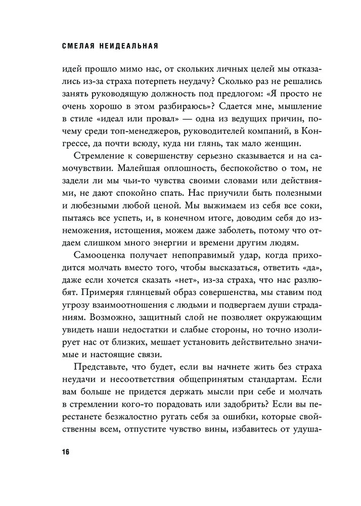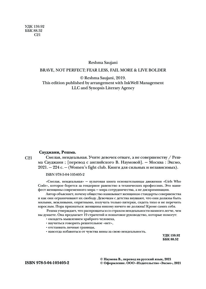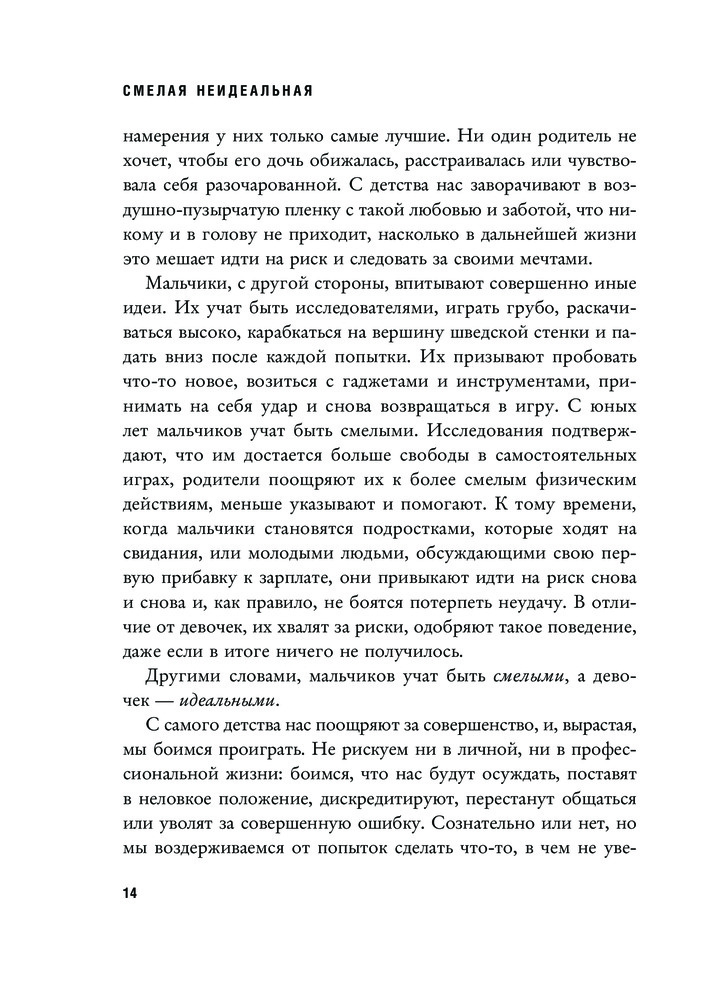Смелая, неидеальная. Учите девочек отваге, а не совершенствуВ данный момент этот товар отсутствует в продаже. Возможно, у нас найдется аналогичный или похожий товар здесь. Серия: Women's fight club. Книги для сильных и независимых «Смелая, неидеальная» — культовая книга основательницы движения «Girls Who Code», которое борется за гендерное равенство в технических профессиях. Это манифест женщины современного мира — мира сотрудничества, а не дискриминации. Автор объясняет, почему общество навязывает женщинам стандарты совершенства и как они ограничивают их свободу. Девочкам с детства внушают, что они должны быть милыми, вежливыми, опрятными, получать только пятерки, сидеть тихо и не перечить взрослым. Пора признаться: женщины никому ничего не должны! Кроме самих себя. Решма утверждает, что распрощаться со страхом неидеальности намного легче, чем вы думаете. Она предлагает 19 стратегий и пошаговое руководство которые помогут: o овладеть мышлением храброго человека, o научиться говорить решительное «нет», o отстаивать личные границы, o навсегда избавиться от чувства вины за свою неидеальность. |
