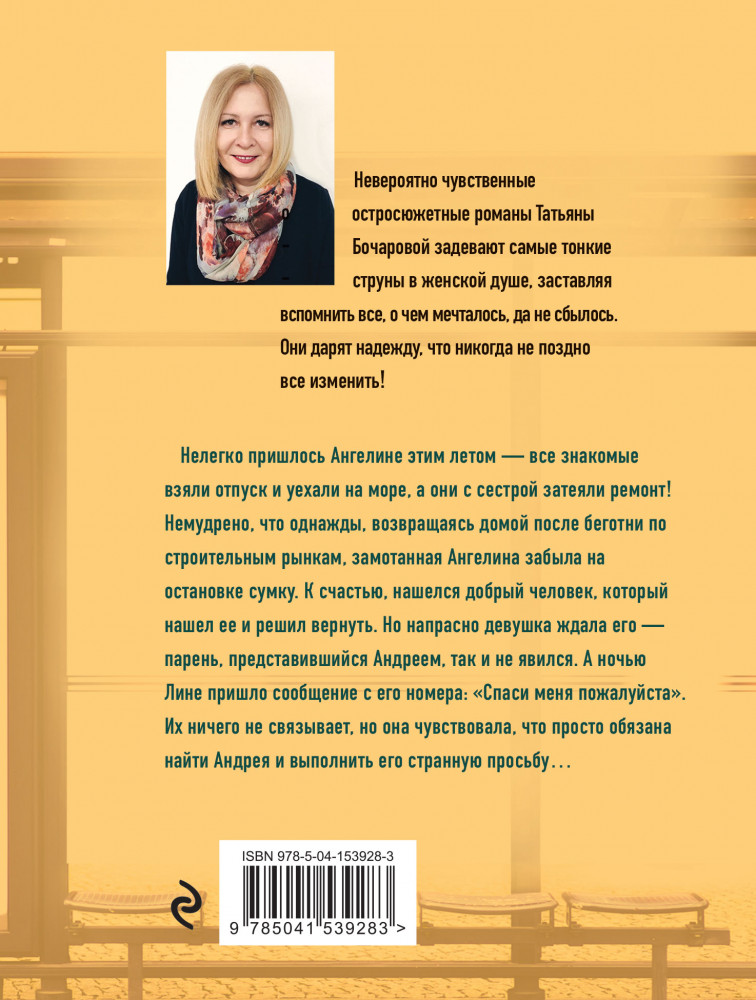 Спаси меня, пожалуйста!Татьяна Александровна Бочарова В данный момент этот товар отсутствует в продаже. Возможно, у нас найдется аналогичный или похожий товар здесь. Серия: Детектив сильных страстей. Романы Т. Бочаровой (обложка) Нелегко пришлось Ангелине этим летом — все знакомые взяли отпуск и уехали на море, а они с сестрой затеяли ремонт! Немудрено, что однажды, возвращаясь домой после беготни по строительным рынкам, замотанная Ангелина забыла на остановке сумку. К счастью, нашелся добрый человек, который нашел ее и решил вернуть. Но напрасно девушка ждала его — парень, представившийся Андреем, так и не явился. А ночью Лине пришло сообщение с его номера: «Спаси меня, пожалуйста». Их ничего не связывает, но она чувствовала, что просто обязана найти Андрея и выполнить его странную просьбу... |