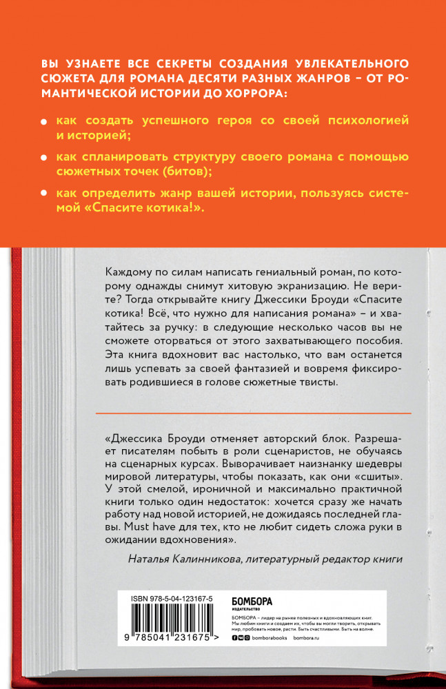 Спасите котика! Всё, что нужно для написания романаВ данный момент этот товар отсутствует в продаже. Возможно, у нас найдется аналогичный или похожий товар здесь. Серия: Мастер сцены (обложка) Книга Блейка Снайдера «Спасите котика! Всё, что нужно знать о сценарии» помогла тысячам читателей в написании собственного сценария и стала бестселлером во множестве стран. Но что делать, если хочется писать прозу, — за какое руководство хвататься? Писательница Джессика Броуди решила пойти по стопам Блейка Снайдера и разработала собственную методику по написанию романа, опираясь на те уроки, которые сценарист зафиксировал в своем руководстве. |