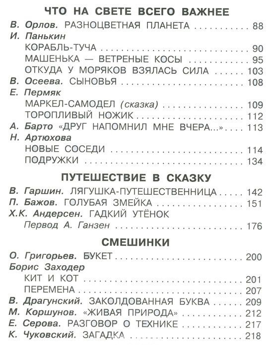 Отличная книга для младших школьников. Очень хорошо подобраны произведения. Интересные иллюстрации помогаю детям фантазировать и представлять прочитанное. Содержание: ВРЕМЕНА ГОДА A. Твардовский. ЛЕС ОСЕНЬЮ B. Бианки. СЕНТЯБРЬ Л. Воронкова. ТАНИНЫ ДЕЛА К. Бальмонт. К ЗИМЕ Н. Сладков. СУД НАД ДЕКАБРЁМ. Сказка Н. Саконская. ЗИМНИЙ ПРАЗДНИК A. Чехов. ВЕСНОЙ Я. Аким. АПРЕЛЬ Н. Сладков. ИВОВЫЙ ПИР Ю. Дмитриев. РАССКАЗЫ СТАРИЧКА-ЛЕСОВИЧКА О БРАТЬЯХ НАШИХ МЕНЬШИХ Н. Сладков. МЕДВЕЖЬЯ ГОРКА ОСЕННИЕ РАДОСТИ Э. Шим. ТЯЖКИЙ ТРУД Б. Житков. ПРО СЛОНА B. Бианки. ПЛАВУНЧИК ЧТО НА СВЕТЕ ВСЕГО ВАЖНЕЕ C. Михалков. БУДЬ ЧЕЛОВЕКОМ И. Панькин. КОРАБЛЬ-ТУЧА МАШЕНЬКА - ВЕТРЕНЫЕ КОСЫ ОТКУДА У МОРЯКОВ ВЗЯЛАСЬ СИЛА В. Осеева. СЫНОВЬЯ Е. Пермяк. МАРКЕЛ-САМОДЕЛ. Сказка ТОРОПЛИВЫЙ НОЖИК С. Михалков. ФИНТИФЛЮШКИН Л. Толстой. ОТЕЦ И СЫНОВЬЯ A. Барто "ДРУГ НАПОМНИЛ МНЕ ВЧЕРА..." Н. Артюхова. НОВЫЕ СОСЕДИ ПОДРУЖКИ ПУТЕШЕСТВИЕ В СКАЗКУ B. Гаршин. ЛЯГУШКА-ПУТЕШЕСТВЕННИЦА П. Бажов. ГОЛУБАЯ ЗМЕЙКА Г. X. Андерсен. ГАДКИЙ УТЁНОК СМЕШИНКИ C. Михалков. КАК СТАРИК КОРОВУ ПРОДАВАЛ О. Григорьев. БУКЕТ Б. Заходер. КИТ И КОТ Ю. Тувим. СЛОВЕЧКИ-КАЛЕЧКИ В. Драгунский. ЗАКОЛДОВАННАЯ БУКВА К. Чуковский. ЗАГАДКА