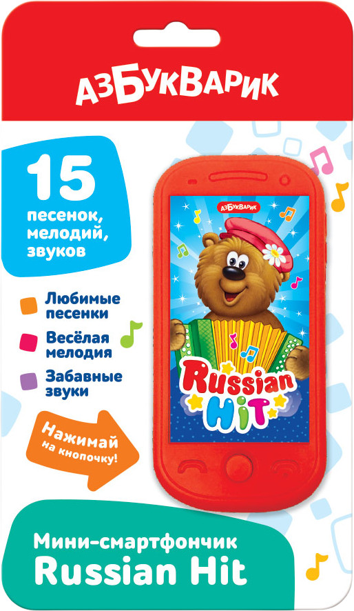Азбукварик Мини-смартфончик «Russian Hit»В данный момент этот товар отсутствует в продаже. Возможно, у нас найдется аналогичный или похожий товар здесь. Серия: Смартфончик Современный мини-смартфончик для современных малышей! Игрушка идеально подойдет для маленьких ручек благодаря небольшому размеру и закруглённым уголкам. Малыш сможет подружиться с милым мишуткой и послушать детские хиты в русском народном стиле («Медвежонок — лучший друг», «Топ-топ-топ», «Калинка», «Два весёлых гуся», «Антошка» и др.). На яркую кнопочку захочется нажимать снова и снова! |