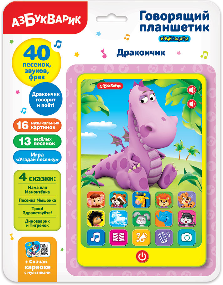 💳 Оплатить за товар можно при получении 🇰🇿 Есть бесплатная доставка по Казахстану от 1 дня 🎁 Копите бонусы с каждой покупки Серия: Говорящий планшетик В говорящем планшетике с весёлым Дракончиком собрано 4 мультсказки («Мама для Мамонтёнка», «Песенка Мышонка», «Трям! Здравствуйте!», «Динозаврик и Тигренок») и 13 песенок известных авторов («Песня Львенка и Черепахи», «Чунга-чанга», «Где-то в жаркой Африке», «Облака», «Жил да был веселый ежик», «Зарядка» и другие). Нажимай, слушай, подпевай любимым героям! Угадывай песенки! |