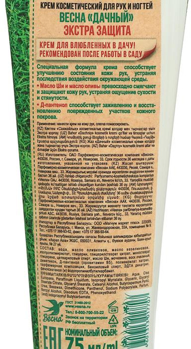 Весна Крем для рук и ногтей «Дачный»В данный момент этот товар отсутствует в продаже. Возможно, у нас найдется аналогичный или похожий товар здесь. Специальная формула крема способствует улучшению состояния кожи рук, устраняя последствия окружающей среды. Масло Ши и масло оливы превосходно смягчают и защищают кожу рук, устраняя ощущения сухости и стянутости. Д-пантенол способствует заживлению и восстановлению поврежденных участков кожного покрова. |