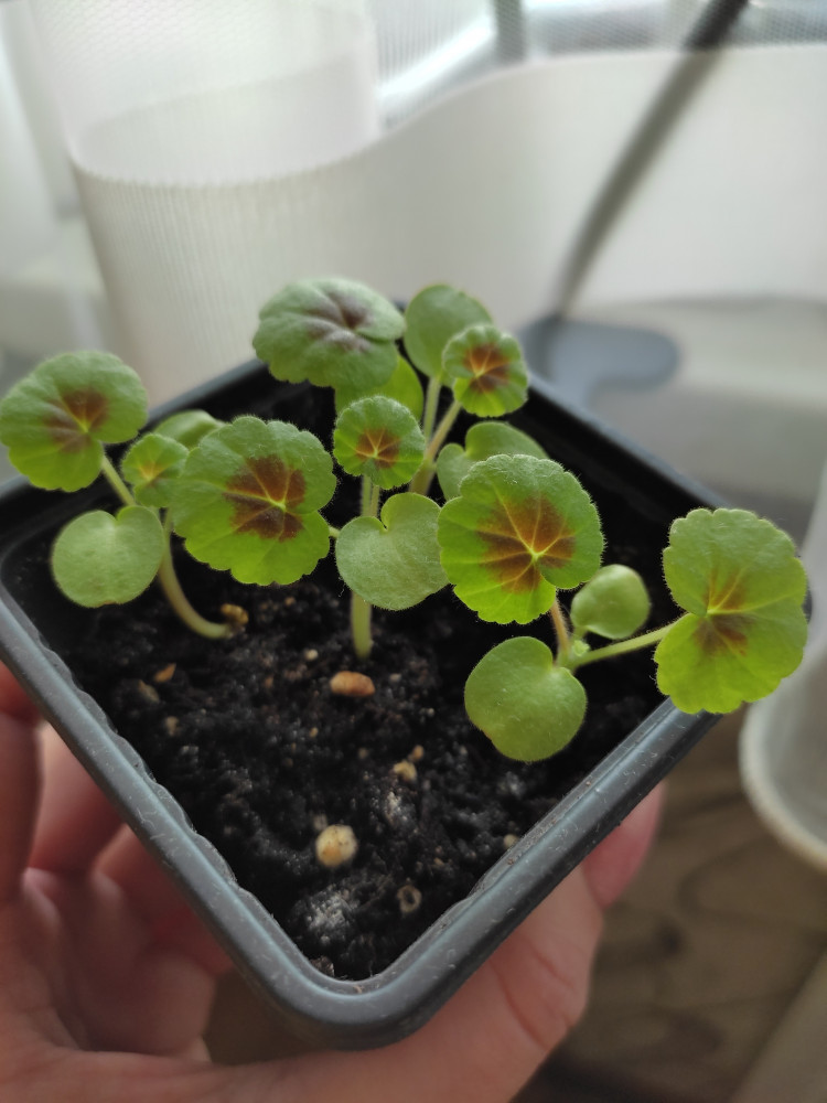Из 5 взошли 4 . Растут очень медленно. Цвет листьев уже красивый, отличается от обычной пеларгонии. На фото саженцам месяц.