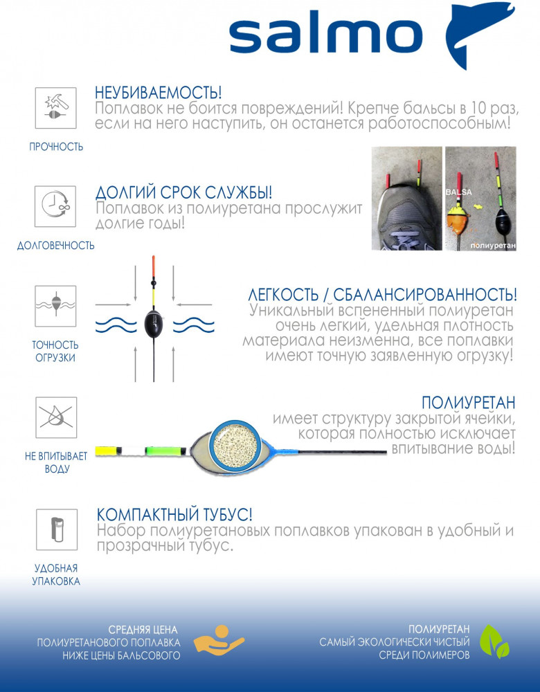 💳 Оплатить за товар можно при получении 🇰🇿 Есть бесплатная доставка по Казахстану от 1 дня 🎁 Копите бонусы с каждой покупки Набор функциональных поплавков, которые могут использоваться как днём, так и ночью. Поплавки оснащены съёмной антенной, на место которой можно установить светлячок диаметром 4,5мм. Все поплавки изготовлены из вспененного полиуретана, что делает их фактически «неубиваемыми». Поплавок сохраняет работоспособность, даже если вы случайно наступите на него. Благодаря особой структуре материала в виде «закрытой ячейки» эти поплавки не впитывают воду. Неизменная удельная плотность материала обеспечивает точную заявленную отгрузку, при этом при одинаковой отгрузке по сравнению с другими поплавками тело полиуретановых поплавков меньше в объёме, что делает их более функциональными. Набор комплектуется удобным и надёжным пластиковым тубусом для хранения и перевозки. |