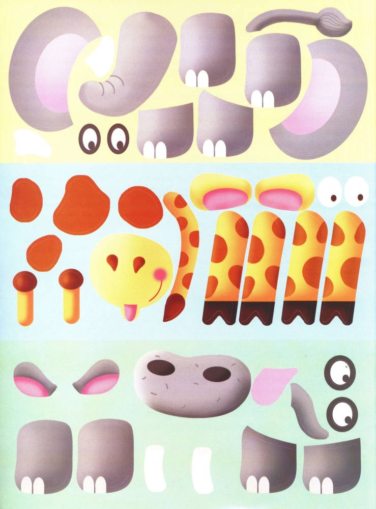 Книжка понравилась, дочка 3 года сама с ней занималась - приклеивала сама части тела, не всегда к месту, но главное ребенок был занят..) текст, на мой взгляд бесполезный и не информативный. В книге 6 животных, которым нужно приклеить лапы, уши, нос, глаза, мордочку и хвост.