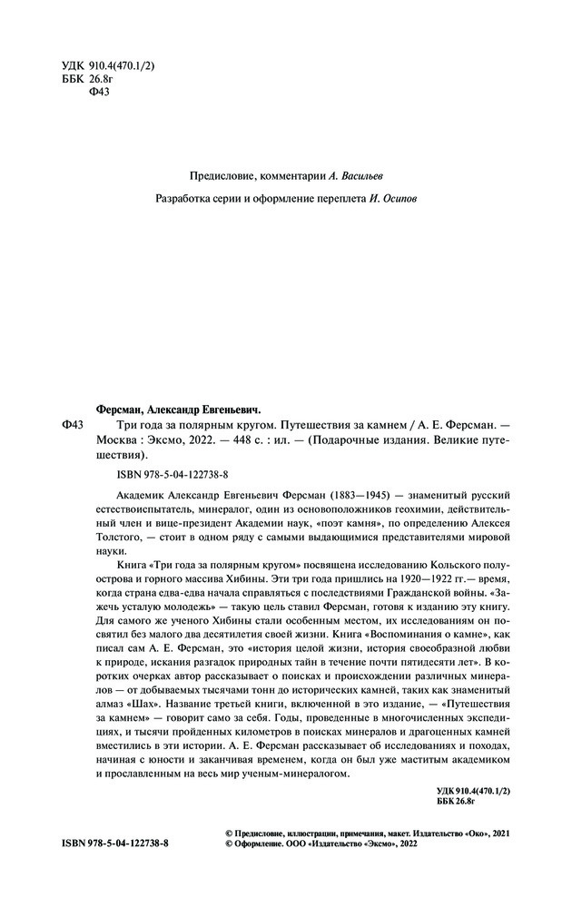 Три года за полярным кругом. Путешествия за камнемВ данный момент этот товар отсутствует в продаже. Возможно, у нас найдется аналогичный или похожий товар здесь. Серия: Подарочные издания. Великие путешествия Академик Александр Евгеньевич Ферсман (1883–1945) — знаменитый русский естествоиспытатель, минералог, один из основоположников геохимии, «поэт камня», действительный член и вице-президент Академии наук; член Императорского православного Палестинского общества — стоит в одном ряду с самыми выдающимися представителями мировой науки. В нашей стране Ферсман побывал, наверное, везде: от Кавказа и Кольского полуострова до Дальнего Востока. Но самыми дорогими местами на карте страны для Ферсмана были Хибины, Средняя Азия и Урал. |
