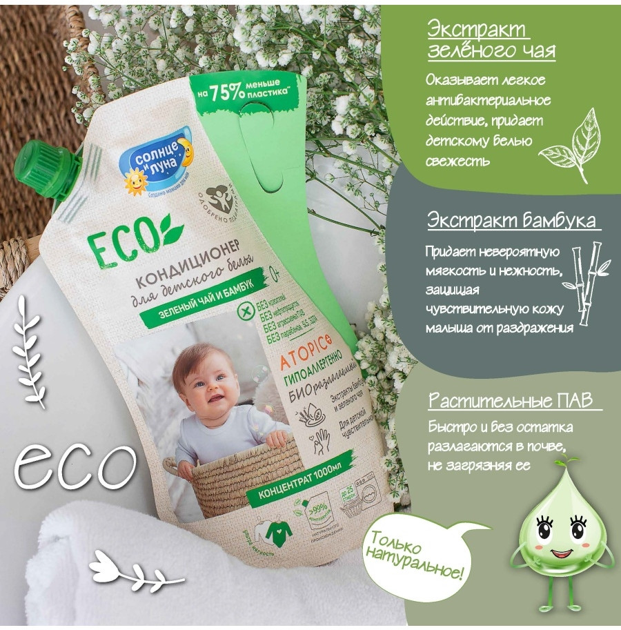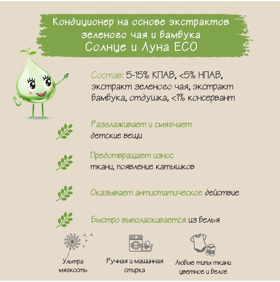 Солнце и луна Кондиционер для детского белья «Зеленый чай и бамбук»В данный момент этот товар отсутствует в продаже. Возможно, у нас найдется аналогичный или похожий товар здесь. Гипоаллергенный кондиционер для детского белья (одежды, пеленок, постельного белья, полотенец) без отдушки с экстрактами зеленого чая и бамбука специально разработан для детей с первых дней жизни и людей с чувствительной кожей. |