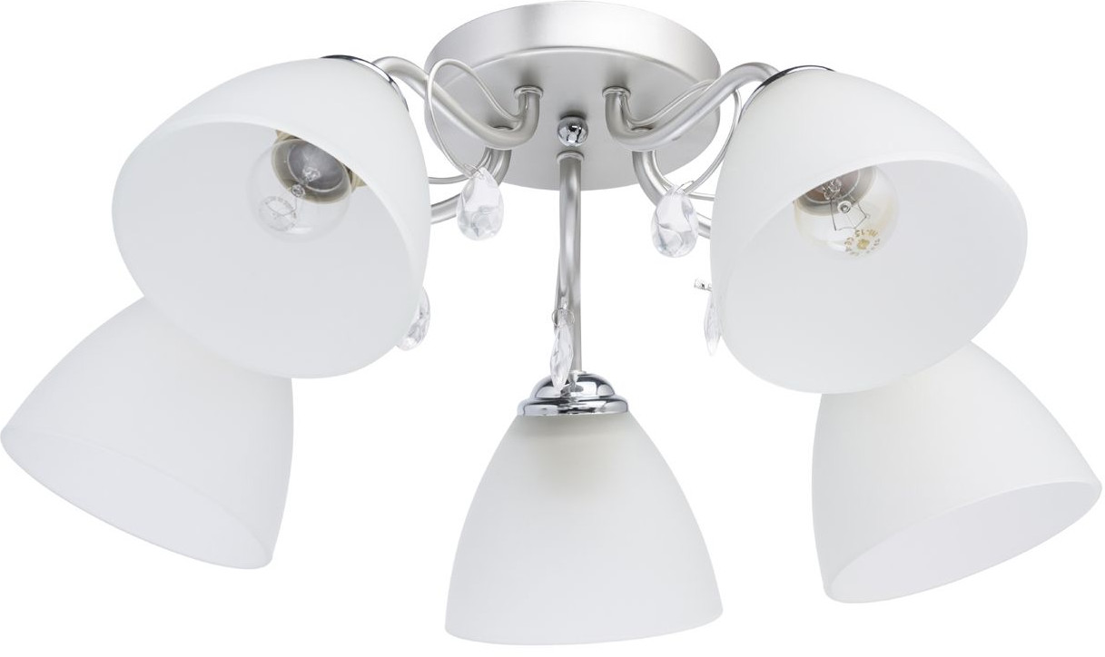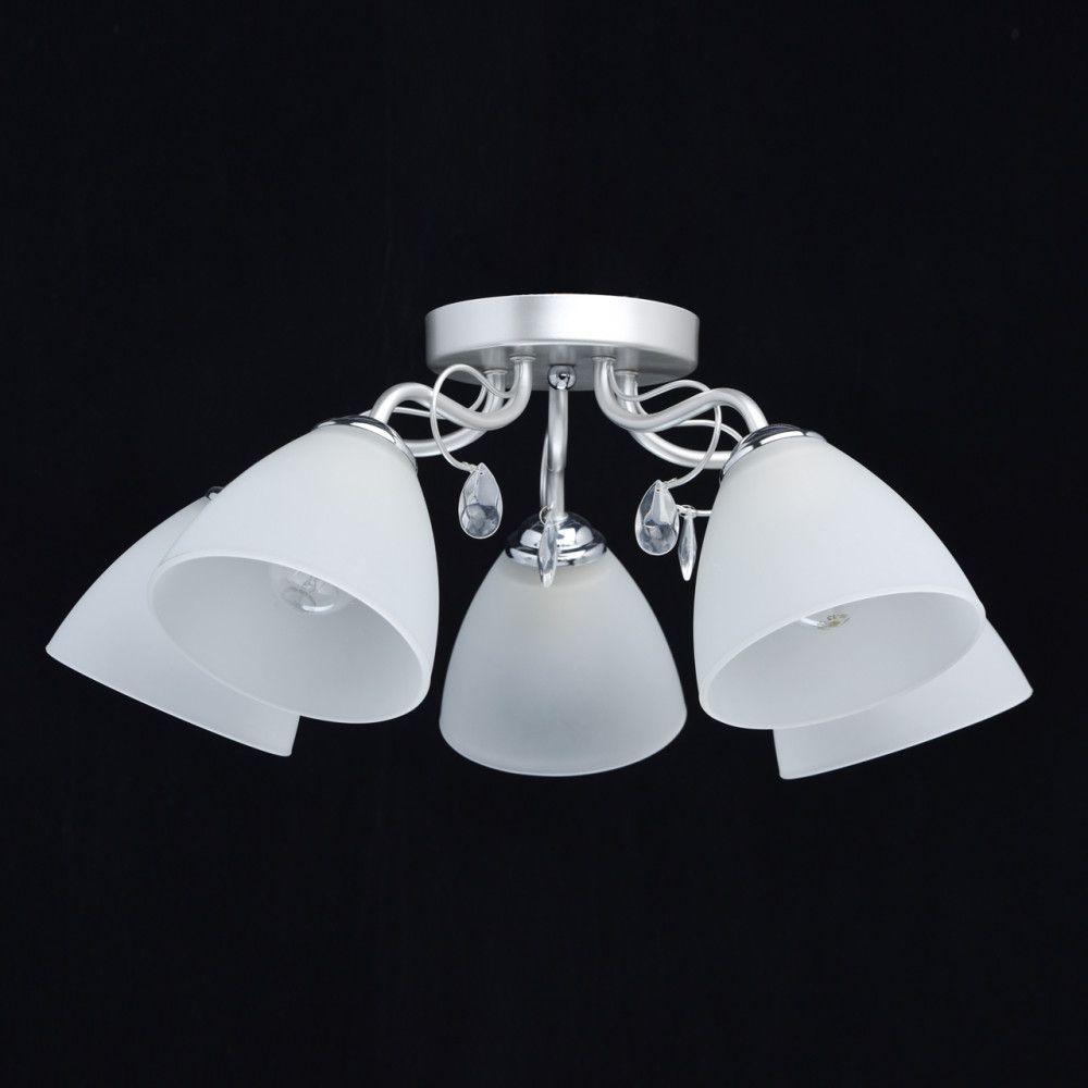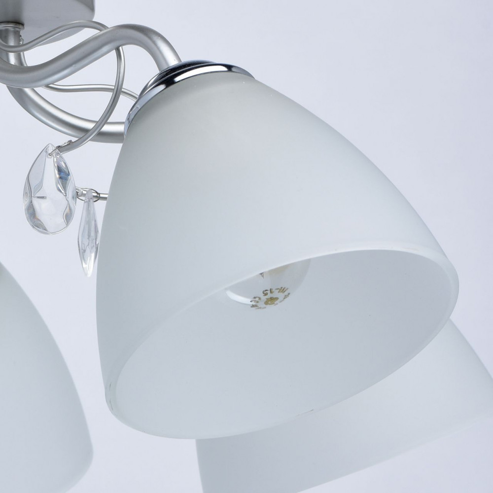 Серия: Нежность Актуальная комбинация металлов цвета перламутрового серебра и глянцевого хрома Плафоны матового стекла белого цвета обеспечивают мягкий световой поток Декор из хрустального стекла создает дополнительный акцент. Компактная высота модели идеальна для стандартной высоты потолка. Основание светильника выполнено из металла и окрашено в цвет перламутрового серебра. Держатели плафонов гальванизированы в цвет хрома. Плафоны из матированного стекла. Светильник декорирован подвесками из стекла. |