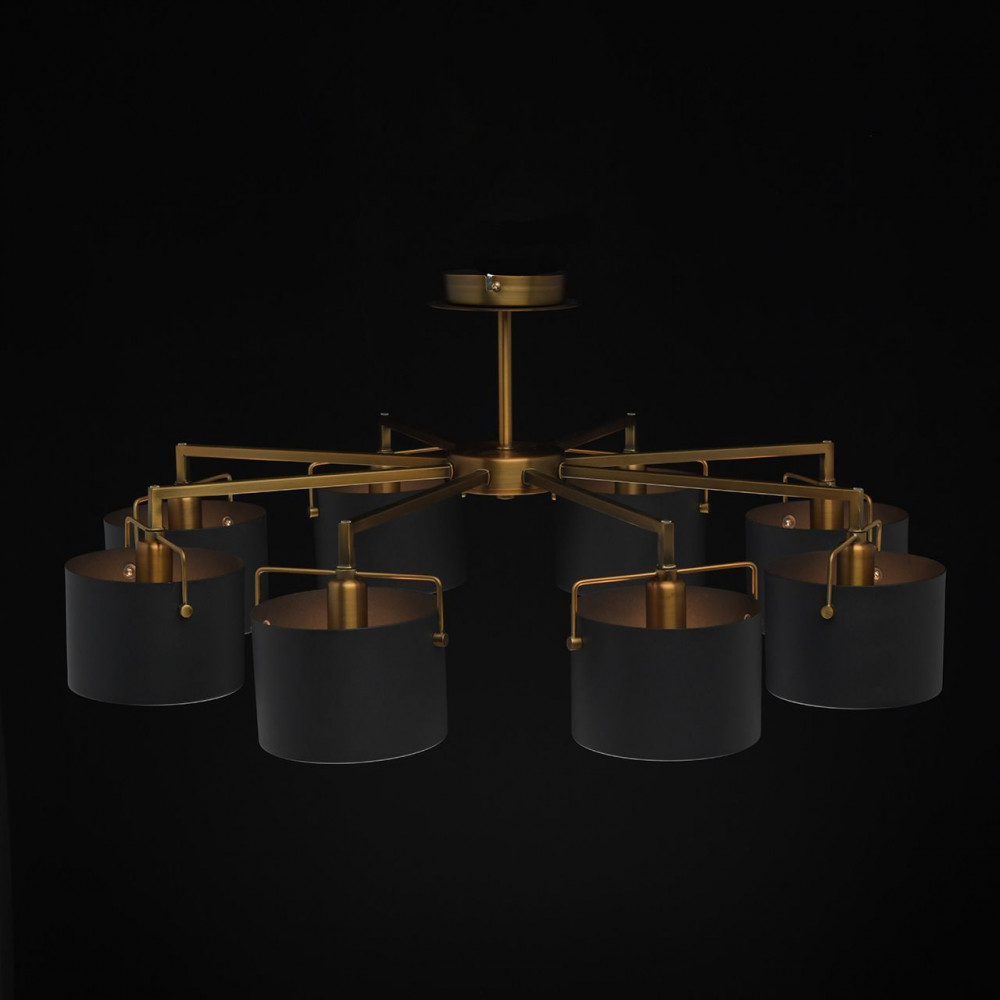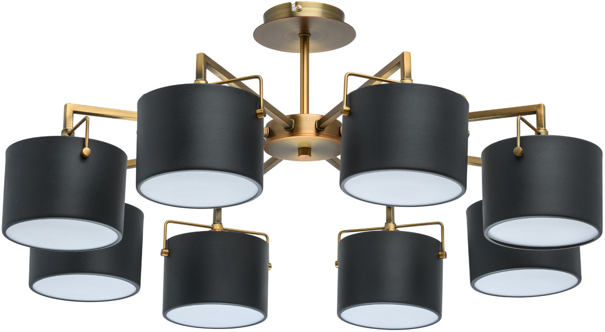Благородное сочетание оттенков, элегантность и современный минималистичный дизайн — у этого светильника сплошные плюсы. Основание из металла выполнено в цвете античной бронзы и подчеркнуто оригинальными геометричными рожками того же оттенка. Под стать классическому тону — глубокий и завораживающий чёрный. В этом цвете представлены металлические абажуры. Источники света в них закрыты вставками из матового акрила: это смотрится очень стильно, а главное — рассеивает световой поток.