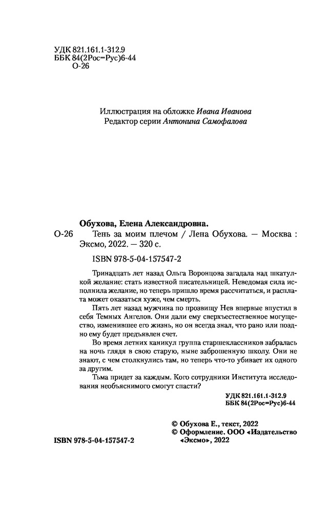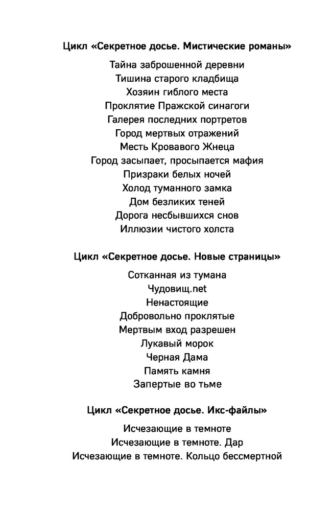 В данный момент этот товар отсутствует в продаже. Возможно, у нас найдется аналогичный или похожий товар здесь. Серия: Секретное досье. Новые страницы Тринадцать лет назад Ольга Воронцова загадала над шкатулкой желание: стать известной писательницей. Неведомая сила исполнила желание, но теперь пришло время рассчитаться, и расплата может оказаться хуже, чем смерть.