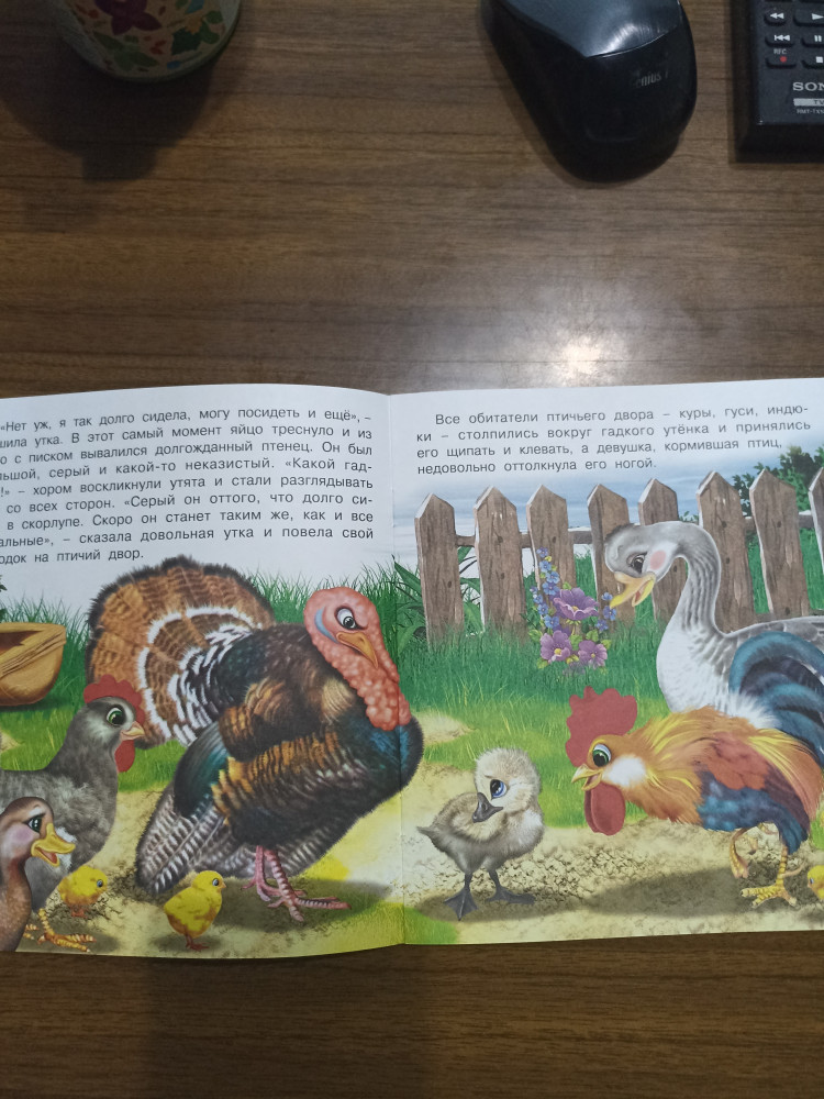 Для чтения с ребенком от возраста полтора - два года. Содержание конечно, упрощено, но зато очень яркая, красивые, не уроды, как сейчас в мультиках, а красивые живые утята, гусята, курочки, петушки и прочее, с симпатичными мордочками. Очень понравилась. Несмотря на цену, книжка хорошая. Страницы не скажу что толстые, но и не промокашки, аккуратный ребенок всю пролистает и случайно не порвет.