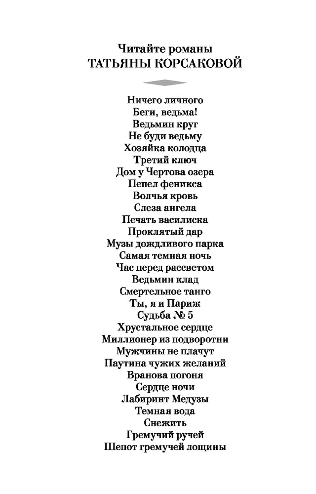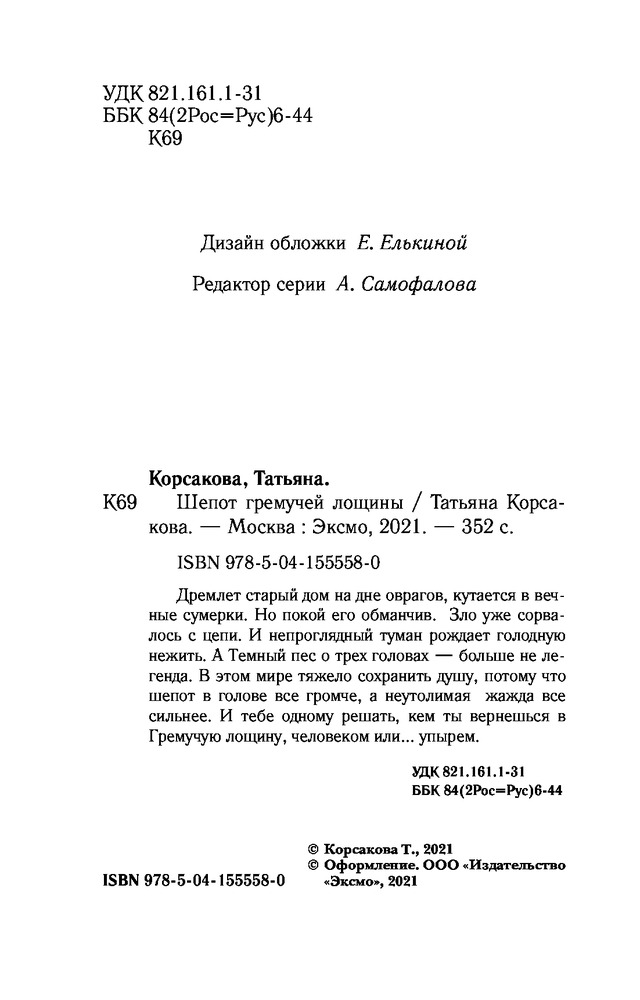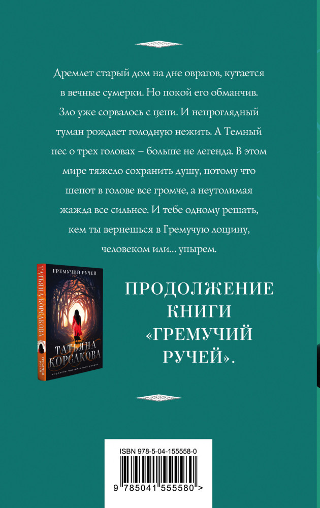 Шепот гремучей лощиныВ данный момент этот товар отсутствует в продаже. Возможно, у нас найдется аналогичный или похожий товар здесь. Серия: Татьяна Корсакова. Королева мистического романа. Новое оформление (обложка) Дремлет старый дом на дне оврагов, кутается в вечные сумерки. Но покой его обманчив. Зло уже сорвалось с цепи. И непроглядный туман рождает голодную нежить. А Темный пес о трех головах — больше не легенда. В этом мире тяжело сохранить душу, потому что шепот в голове все громче, а неутолимая жажда все сильнее. И тебе одному решать, кем ты вернешься в Гремучую лощину, человеком или упырем. |