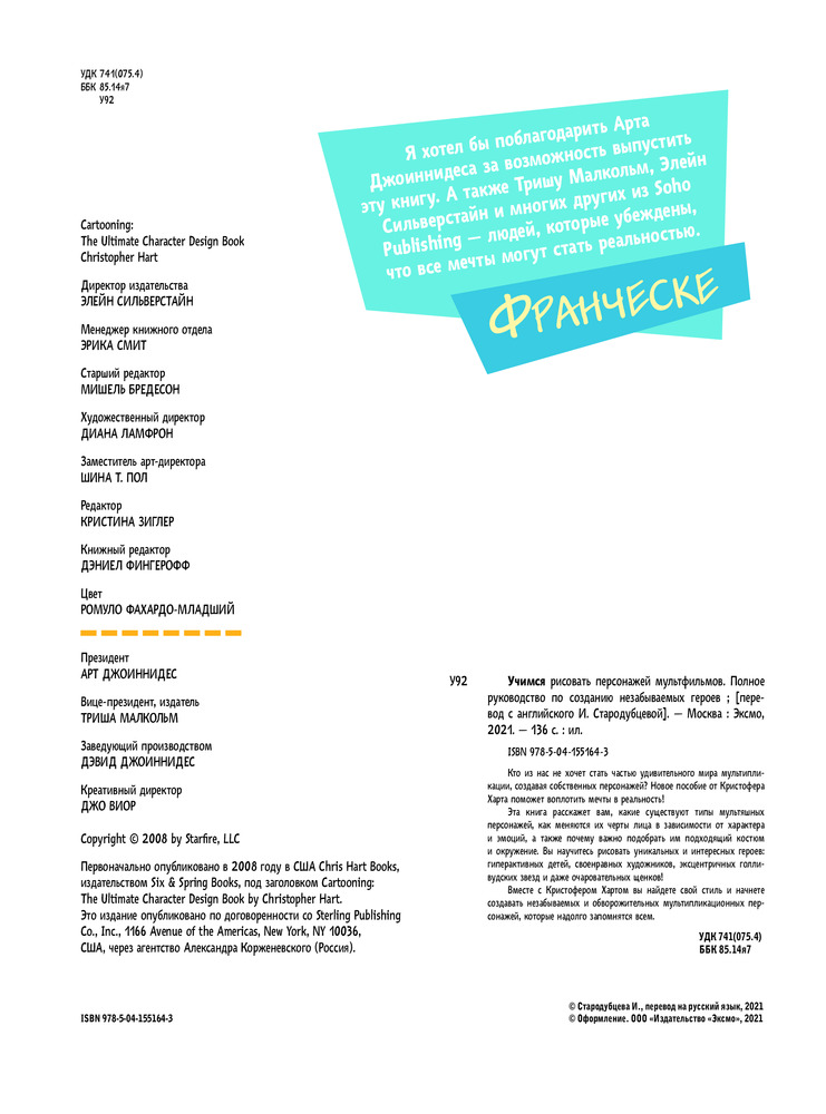 💳 Оплатить за товар можно при получении 🇰🇿 Есть бесплатная доставка по Казахстану от 1 дня 🎁 Копите бонусы с каждой покупки Серия: Учимся рисовать с Кристофером Хартом Кто из нас не хочет стать частью удивительного мира мультипликации, создавая собственных персонажей? Новое пособие от Кристофера Харта поможет воплотить мечты в реальность! Эта книга расскажет вам, какие существуют типы мультяшных персонажей, как меняются их черты лица в зависимости от характера и эмоций, а также почему важно подобрать им подходящий костюм и окружение. Вы научитесь рисовать уникальных и интересных героев: гиперактивных детей, своенравных художников, эксцентричных голливудских звезд и даже очаровательных щенков! Вместе с Кристофером Хартом вы найдете свой стиль и начнете создавать незабываемых и обворожительных мультипликационных персонажей, которые надолго запомнятся всем. |