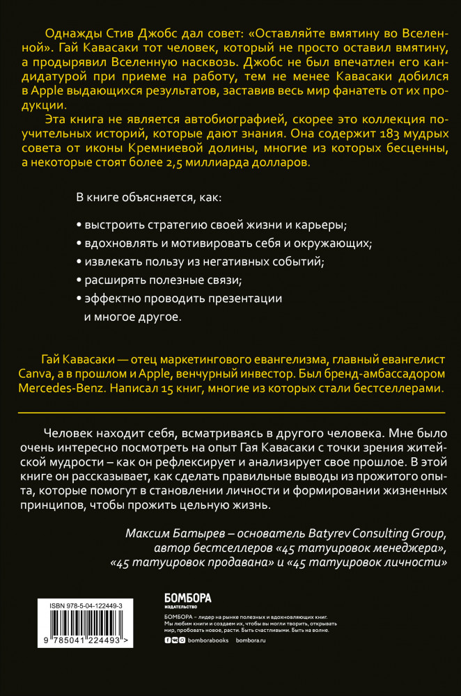 Уроки жизни иконы Кремниевой долиныВ данный момент этот товар отсутствует в продаже. Возможно, у нас найдется аналогичный или похожий товар здесь. Серия: Top Business Awards Однажды Стив Джобс дал совет: «Оставляйте вмятину во Вселенной». Гай Кавасаки тот человек, который не просто оставил вмятину, а продырявил Вселенную насквозь. Джобс не был впечатлен его кандидатурой при приеме на работу, тем не менее Кавасаки добился в Apple выдающихся результатов, заставив весь мир фанатеть от их продукции. Эта книга не является автобиографией, скорее это коллекция поучительных историй, которые дают знания. Она содержит 183 мудрых совета от иконы Кремниевой долины, многие из которых бесценны, а некоторые стоят более 2,5 миллиардов долларов. |