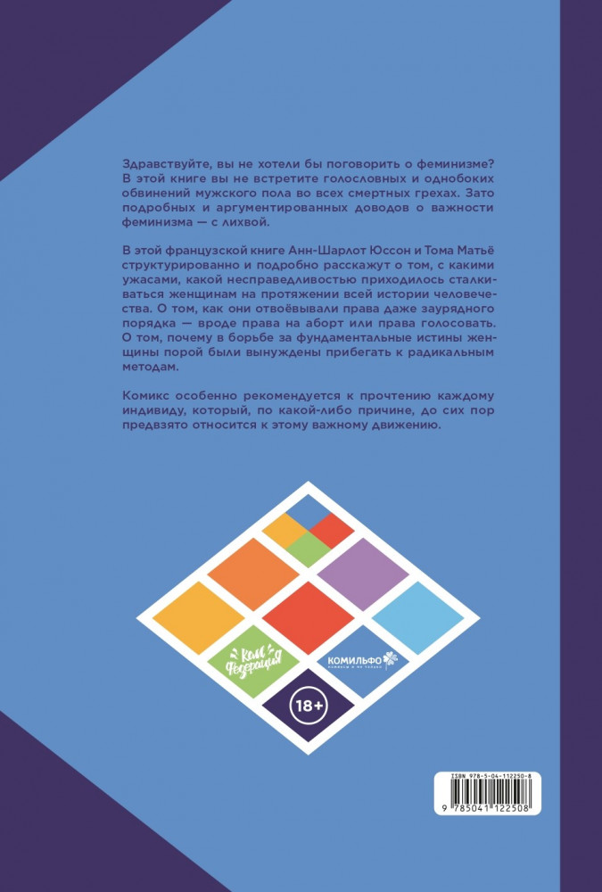 Феминизм в комиксах, цитатах и слоганахВ данный момент этот товар отсутствует в продаже. Возможно, у нас найдется аналогичный или похожий товар здесь. Серия: Комильфо. КомФедерация. Зарубежные комиксы Здравствуйте, вы не хотели бы поговорить о феминизме? В этой книге вы не встретите голословных и однобоких обвинений мужского пола во всех смертных грехах. Зато подробных и аргументированных доводов о важности феминизма — с лихвой. В этой французской книге Анн Шарлот Юссон и Тома Матьё структурировано и подробно расскажут о том, с какими ужасами, какой несправедливостью приходилось сталкиваться женщинам на протяжении всей истории человечества. О том, как они отвоёвывали права даже заурядного порядка — вроде права на аборт или права голосовать. О том, почему в борьбе за фундаментальные истины женщины порой были вынуждены прибегать к радикальным методам. Комикс особенно рекомендуется к прочтению каждому индивиду, который, по какой-либо причине, до сих пор предвзято относится к этому важному движению. |