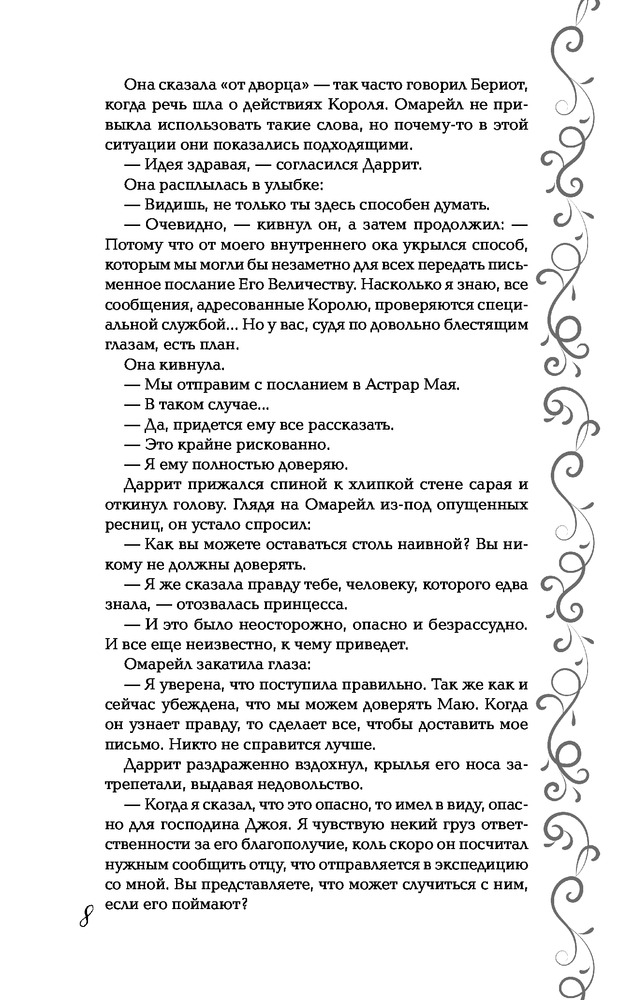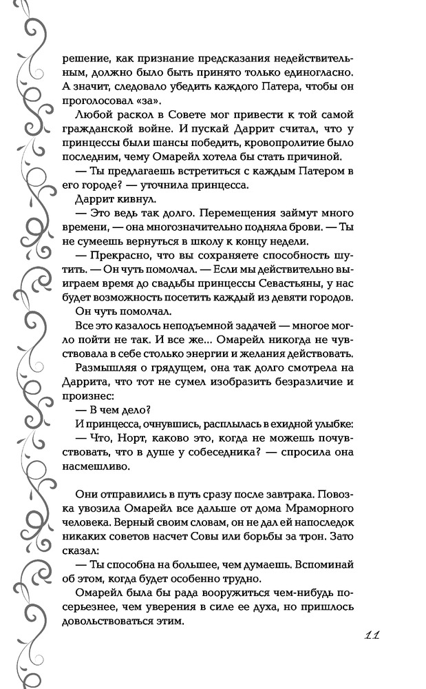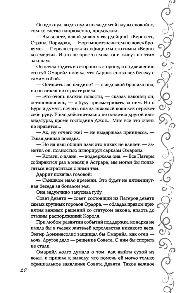 Эксплеты - моя любовь! Вторая книга нам более подробно показала уклад жизни мира, где живёт Омарейл. Причём не только нам, но и принцессе в изгнании. Даааа, ну и заварила кашу Омарейл. Почему-то я только в этой части, посмотрела на ситуацию другими глазами. Если до этого мне было жалко главную героиню, то сейчас я поняла на сколько она поступила эгоистично. Ведь Омарейл не простая девушка, она законная наследница престола и каждый её поступок влияет на будущее государства. Как мы помним при рождении принцессы, было предсказание, в котором говорилось, что Омарейл не должна выходить из башни, иначе будет Гражданская война. Узнав всю правду о своем предсказании, девушке пришлось бежать из башни. Даррит… . Верный, отважный, добрый и милый Даррит! Я влюблена в него. Обожаю таких благородных героев. Ну вот кто бы пошел на такие испытания? Только тот человек, который любит. Вот только Омарейл поняла это не сразу. Эта парочка исколесила девять городов, попала ни в одну передрягу, испытала свою дружбу на прочность. Читая вторую книгу из трилогии «Эксплеты», поняла, что я вообще не сдержанный человек. Мне так хотелось, чтобы главные герои были вместе, признались друг другу в любви, но к сожалению проделки судьбы (и автора) решили по-другому. По накалу страстей и переживаний вторая часть побила все рекорды. Но благодаря этому, герои заиграли новыми красками. «Совет девяти» вышла очень эмоциональной и тёплой.