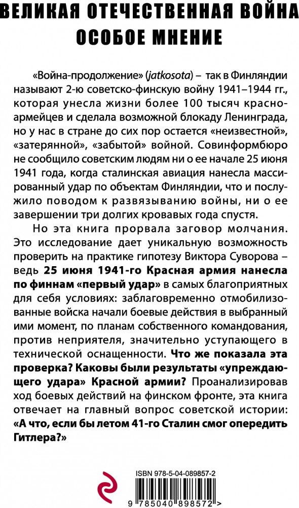«Упреждающий удар» Сталина. 25 июня — глупость или агрессия?В данный момент этот товар отсутствует в продаже. Возможно, у нас найдется аналогичный или похожий товар здесь. Серия: Великая Отечественная война. Особое мнение «Война-продолжение» (jatkosota) — так в Финляндии называют 2-ю советско-финскую войну 1941–1944 гг., которая унесла жизни более 100 тысяч красноармейцев и сделала возможной блокаду Ленинграда, но у нас в стране до сих пор остается «неизвестной», «затерянной», «забытой» войной. Совинформбюро не сообщило советским людям ни о ее начале 25 июня 1941 года, когда сталинская авиация нанесла массированный удар по объектам Финляндии, что и послужило поводом к развязыванию войны, ни о ее завершении три долгих кровавых года спустя. |
