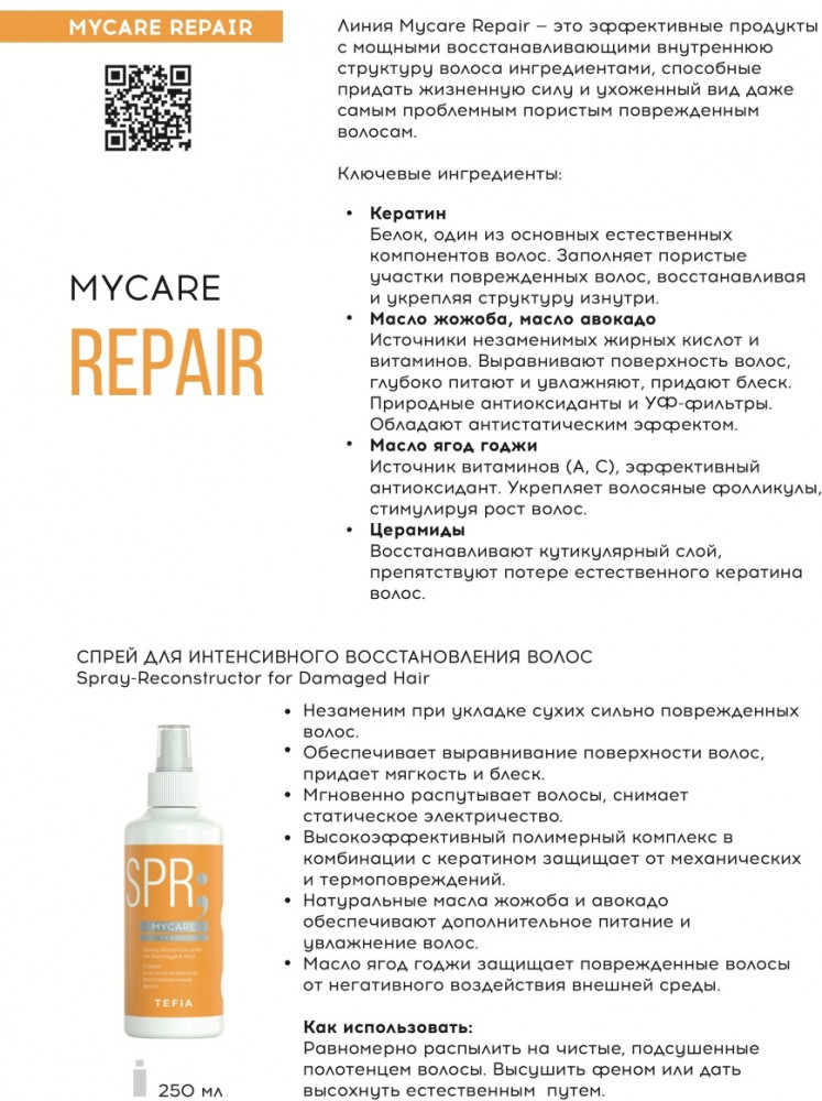 💳 Оплатить за товар можно при получении 🇰🇿 Есть бесплатная доставка по Казахстану от 1 дня 🎁 Копите бонусы с каждой покупки Серия: Mycare Спрей для интенсивного восстановления незаменим при укладке сухих, сильно поврежденных волос. Средство обеспечивает выравнивание поверхности волос, придает мягкость и блеск, мгновенно распутывает волосы, снимает статическое электричество. Высокоэффективный полимерный комплекс в комбинации с кератином защищает от механических и термоповреждений. Натуральные масла жожоба и авокадо обеспечивают дополнительное питание и увлажнение. Масло ягод годжи защищает поврежденные волосы от негативного воздействия внешней среды. |
