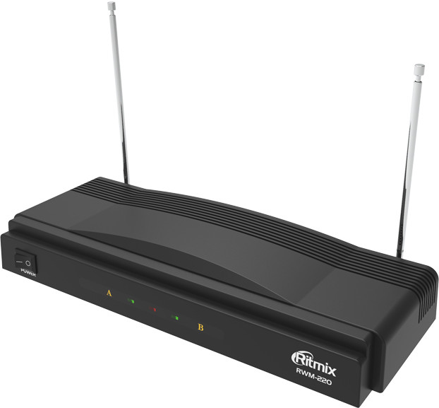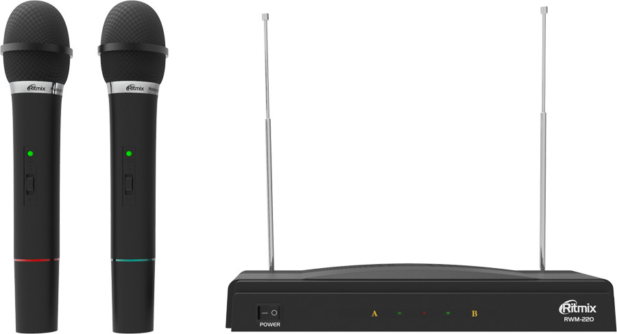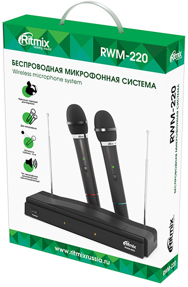 Ritmix RWM-220 — беспроводная микрофонная система VHF-диапазона с двумя микрофонами в комплекте. Это прекрасный вариант для домашнего караоке. Время работы составляет 6 часов. За этот промежуток рука не успеет устать от микрофона, ведь его вес всего 140 г.