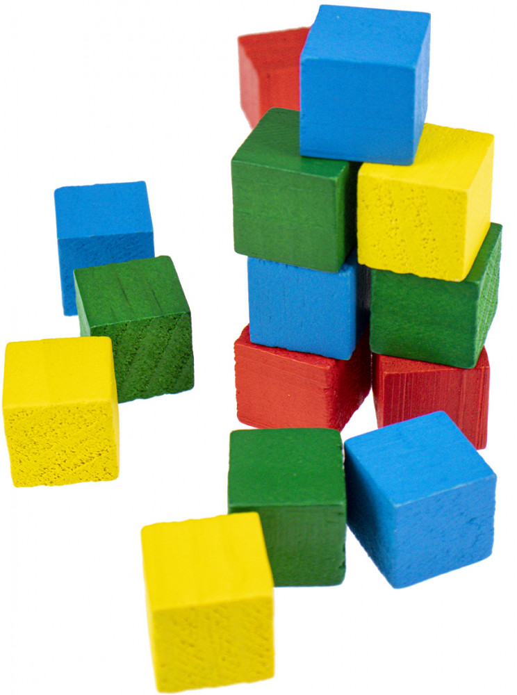 В упаковке 16 маленьких кубиков размером примерно 2*2*2 см, по 4 кубика каждого цвета