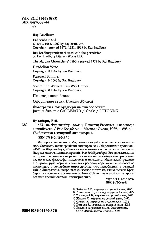 451º по Фаренгейту. Повести. РассказыВ данный момент этот товар отсутствует в продаже. Возможно, у нас найдется аналогичный или похожий товар здесь. Серия: Библиотека Всемирной Литературы Мастер мирового масштаба, совмещающий в литературе несовместимое. Создатель таких ярчайших шедевров, как «Марсианские хроники», «451 по Фаренгейту», «Вино из одуванчиков» и так далее и так далее. Лауреат многочисленных премий. Это Рэй Брэдбери. Его увлекательные истории прославили автора не только как непревзойденного рассказчика, но и как философа, мыслителя и психолога. Магический реализм его прозы, рукотворные механизмы радости, переносящие человека из настоящего в волшебные миры детства, чудо приобщения к великой тайне Литературы, щедро раздариваемое читателю, давно вывели Брэдбери на высокую классическую орбиту. Собранные в этой книге произведения достойное тому подтверждение. |
