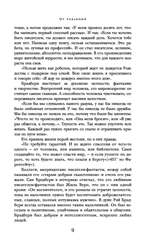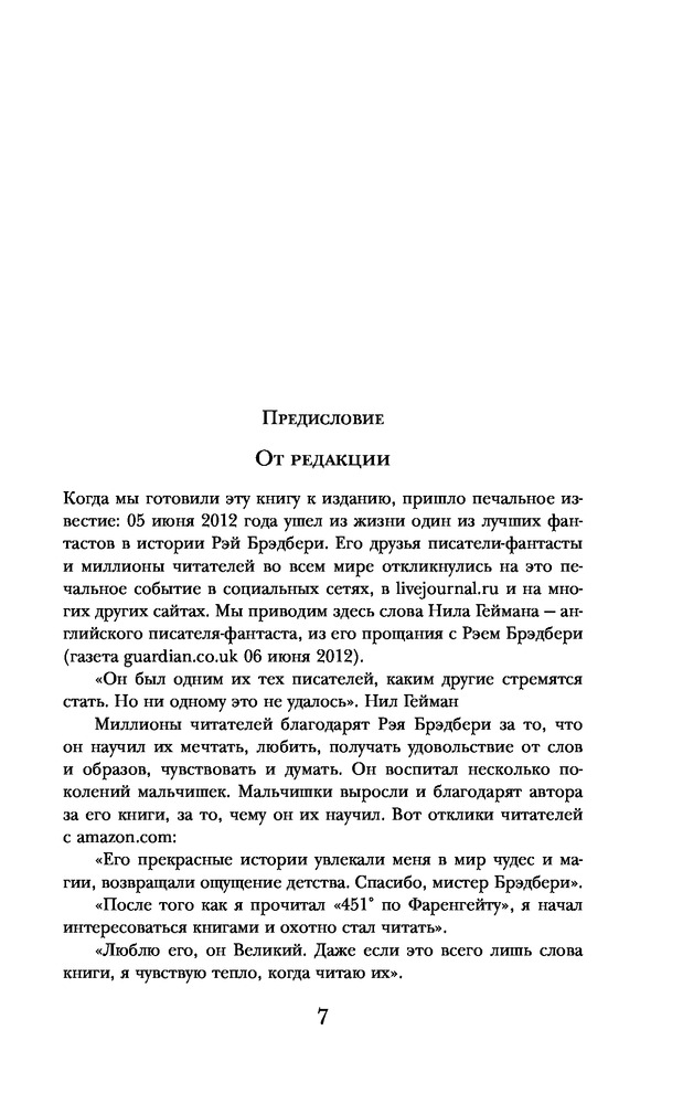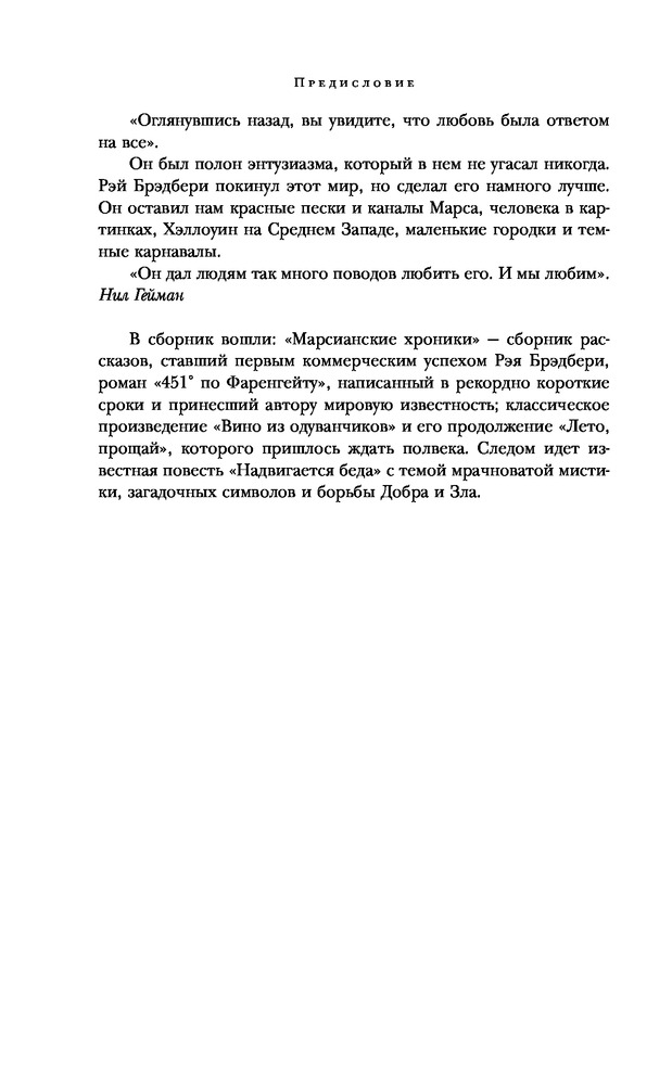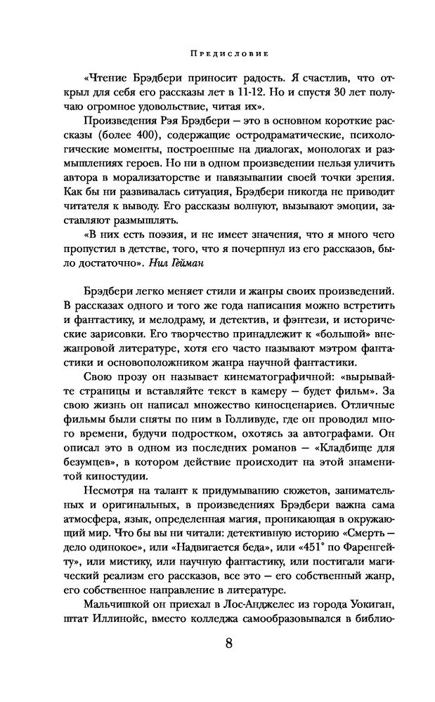 Как оформление так и содержание выше похвал. Все повести и рассказы читаются взахлеб. Прочитав повесть "Вино из одуванчиков", я как бы окунулся в свое детство. Стыдно признаваться, но иногда меня прошибала слеза. Хотя, все происходит в чужой стране, в другом мире, я уловил в этой среде, что-то родное и близкое. Это и есть наверное мастерство гениального писателя Рэя Брэдбери!