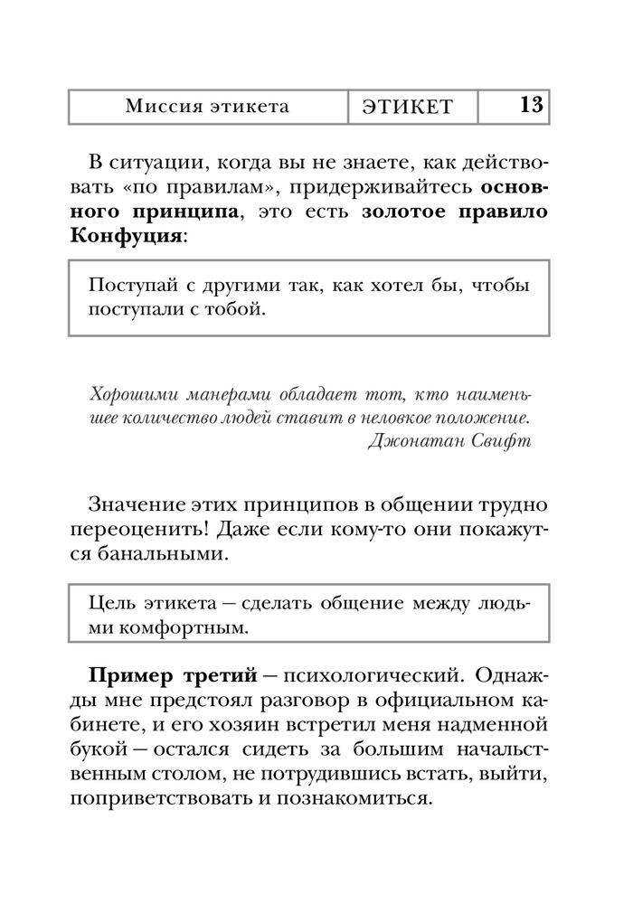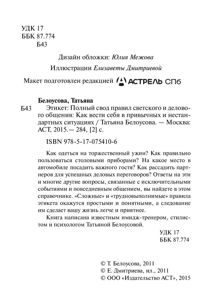 Этикет: полный свод правил светского и делового общения. Как вести себя в привычных и нестандартных ситуациях. Книга-консультантВ данный момент этот товар отсутствует в продаже. Возможно, у нас найдется аналогичный или похожий товар здесь. Серия: Книга - консультант Как одеться на торжественный ужин? Как правильно пользоваться столовыми приборами? На какое место в автомобиле посадить важного гостя? Как рассадить партнеров для успешных деловых переговоров? Ответы на эти и многие другие вопросы, связанные с исключительными событиями и повседневным общением, вы найдете в этом справочнике. «Сложные» и «трудновыполнимые» правила этикета окажутся простыми и понятными, а следование им сделает вашу жизнь легче и приятнее. |