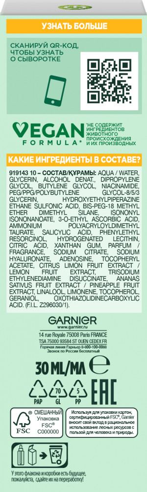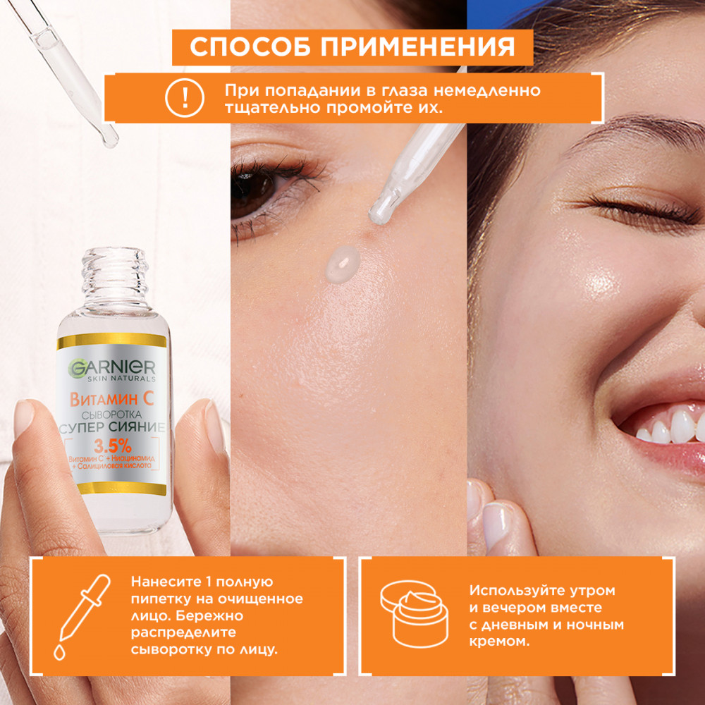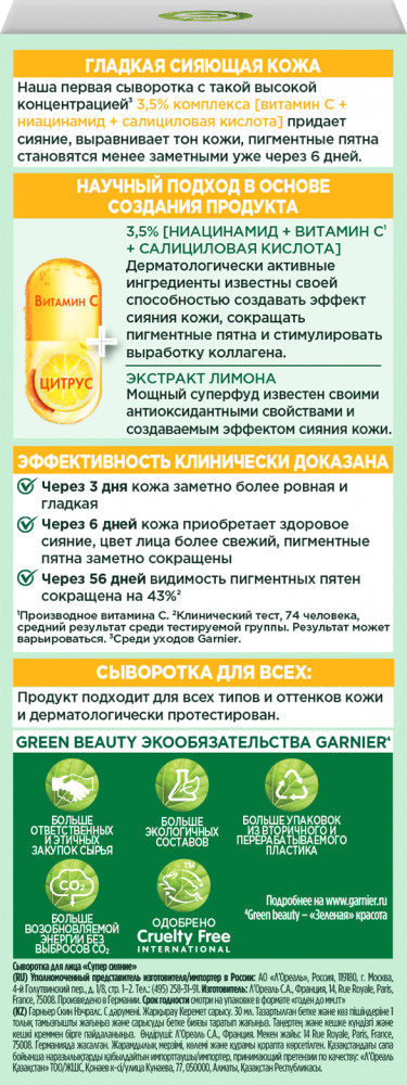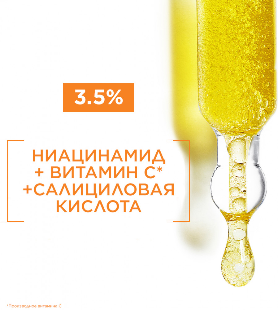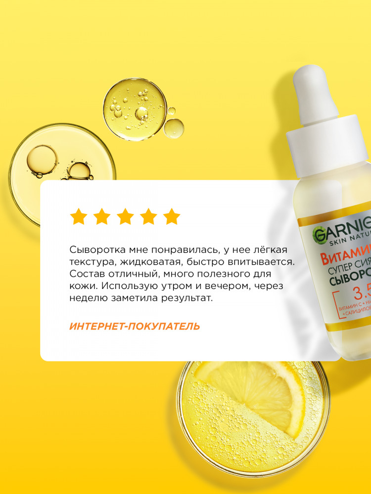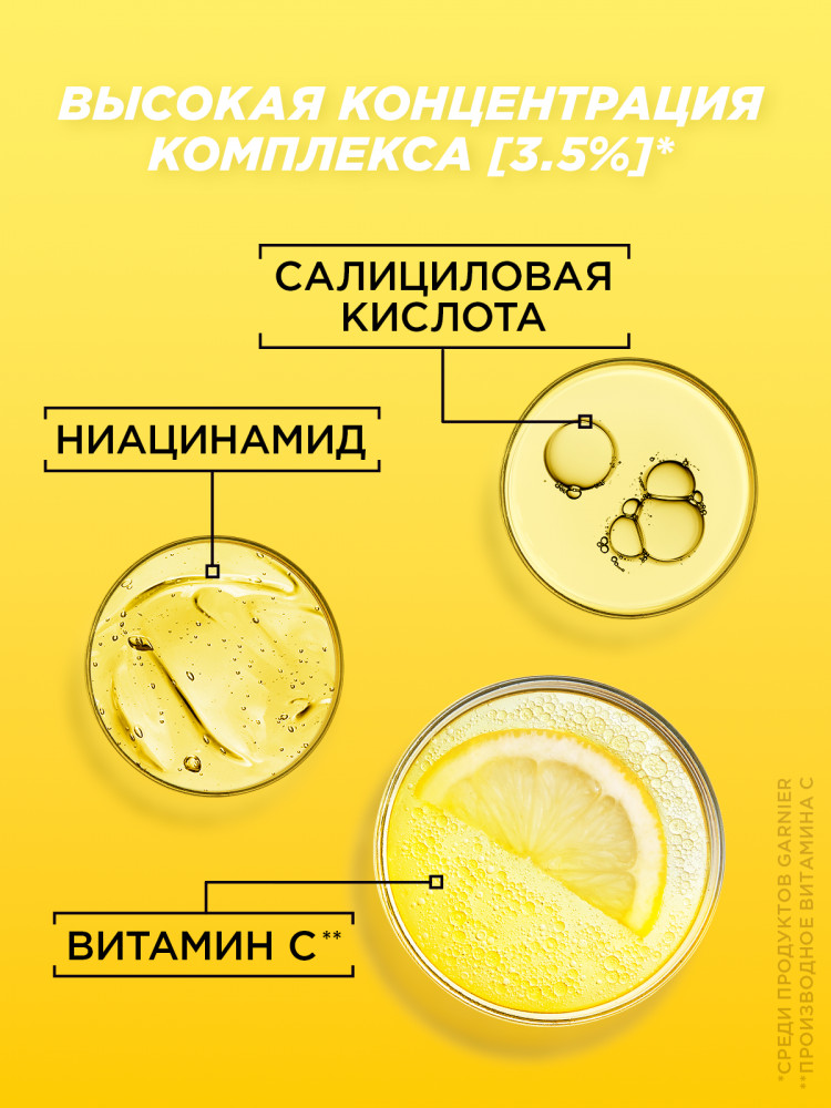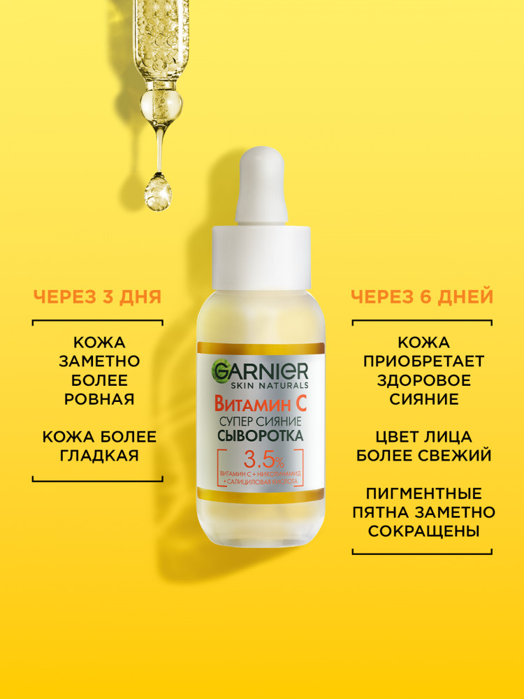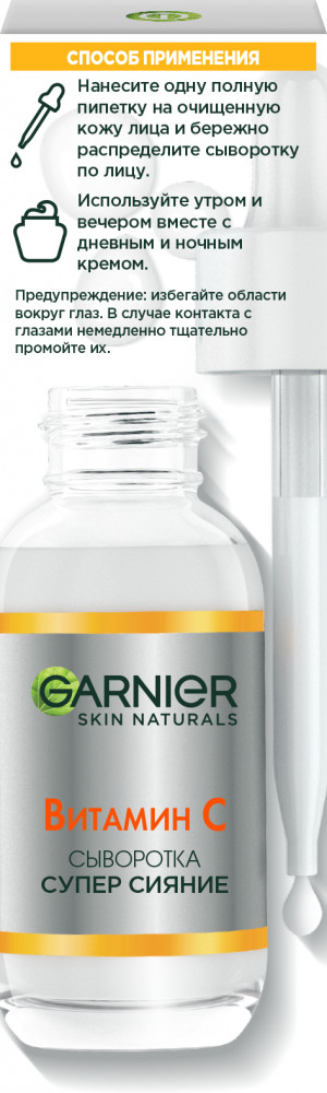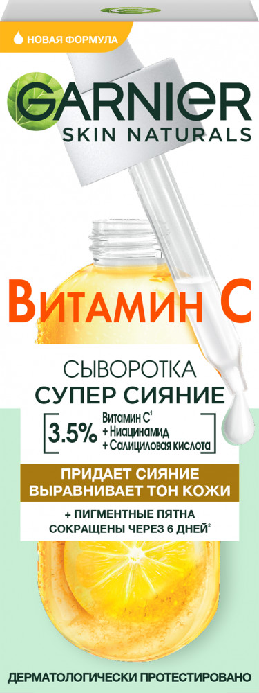 Garnier Сыворотка с витамином С для лица «Супер Сияние» с 3,5% комплекса витамина С, никотинамида и салициловой кислотыВ данный момент этот товар отсутствует в продаже. Возможно, у нас найдется аналогичный или похожий товар здесь. Серия: Skin Naturals Первая сыворотка с такой высокой концентрацией 3,5% комплекса из Витамина С + Никотинамида + Салициловой кислоты придает сияние, выравнивает тон кожи — пигментные пятна становятся менее заметными уже через 6 дней. Дерматологические ингредиенты [Витамин С + Никотинамид + Салициловая кислота] известны своей способностью заметно сокращать пигментные пятна и стимулировать выработку коллагена для заметно более гладкой кожи. Экстракт лимона, этот суперфуд, был выбран благодаря своим потрясающим антиоксидантным свойствам и создаваемому эффекту сияния кожи. Через 3 дня кожа заметно более ровная и гладкая. Через 6 дней кожа приобретает здоровое сияние, цвет лица более свежий, пигментные пятна заметно сокращены. |