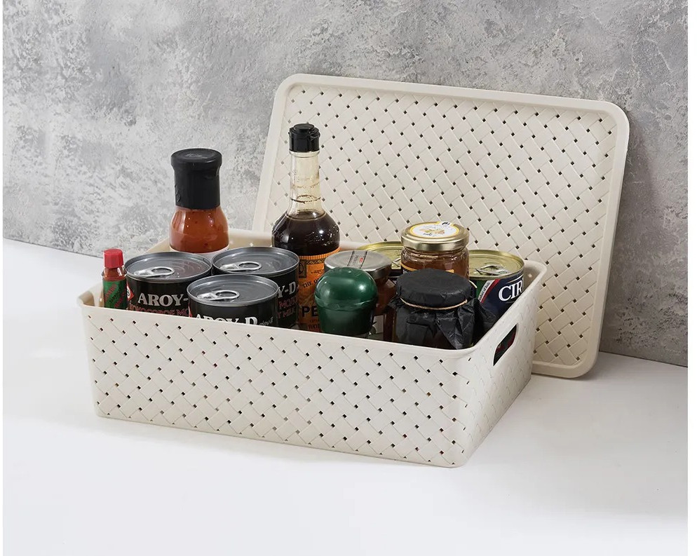 Корзины очень понравились. Качество хорошее, не тонкие и не толстые, в самый раз. Я их накупила уже много и большие и даже маленькие, удобные. Крышки не плотно прилигают, но мне именно так надо было. По моему мнению крышки больше для того, чтоб можно было корзинки друг на друга ставить.
